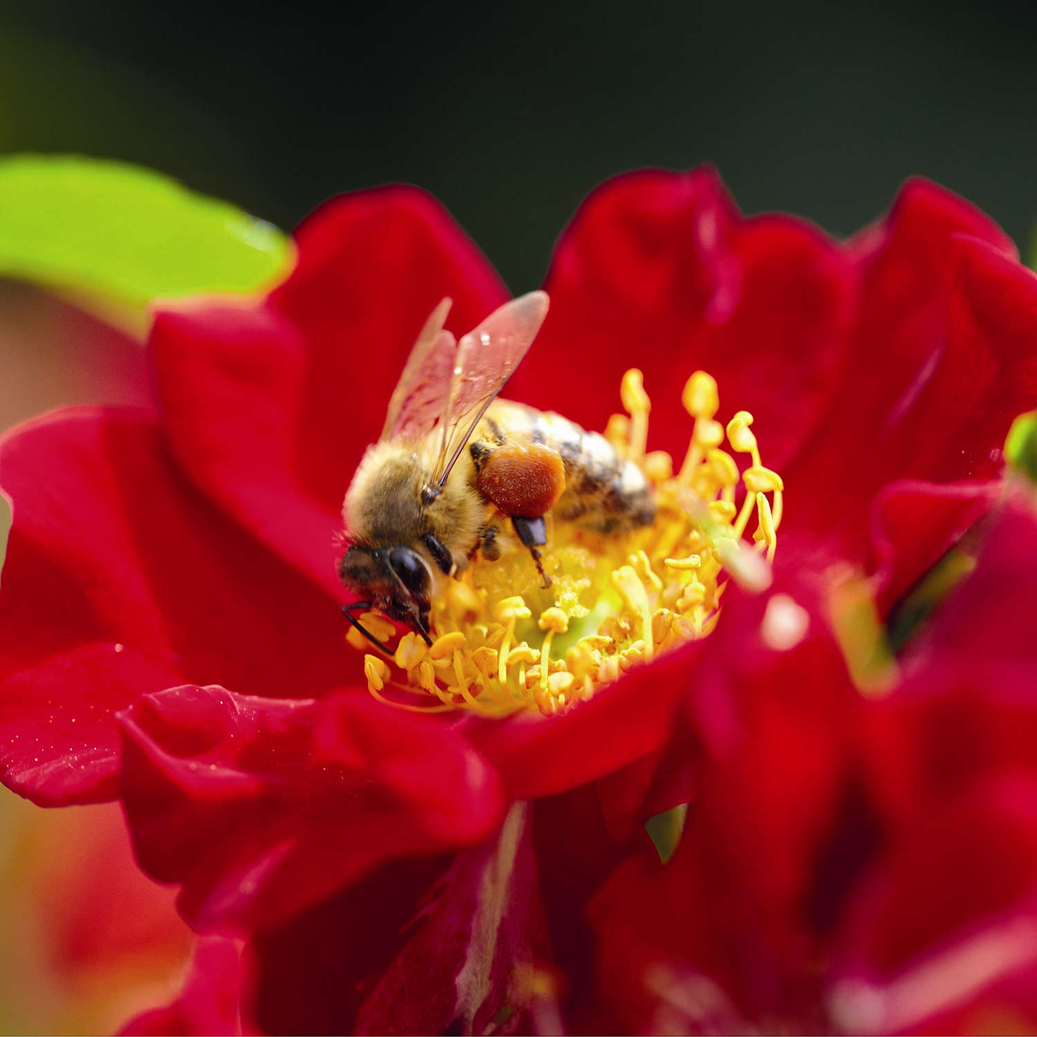 Die Beetrose 'Bienenweide® Rot' ist mit ihrer dunkelroten Blütenpracht und dem markanten gelben Auge ein echter Hingucker in jedem Garten. Als kompakt wachsende Bodendeckerrose zieht sie nicht nur die Blicke auf sich, sondern auch zahlreiche Bienen, Hummeln und Schmetterlinge.