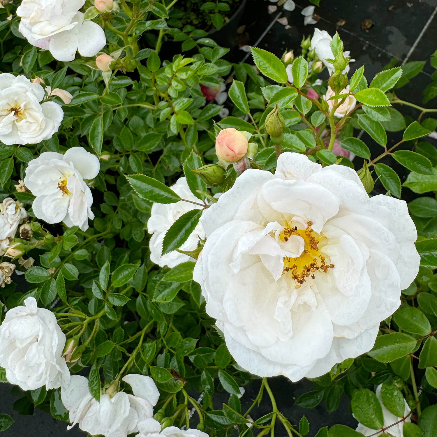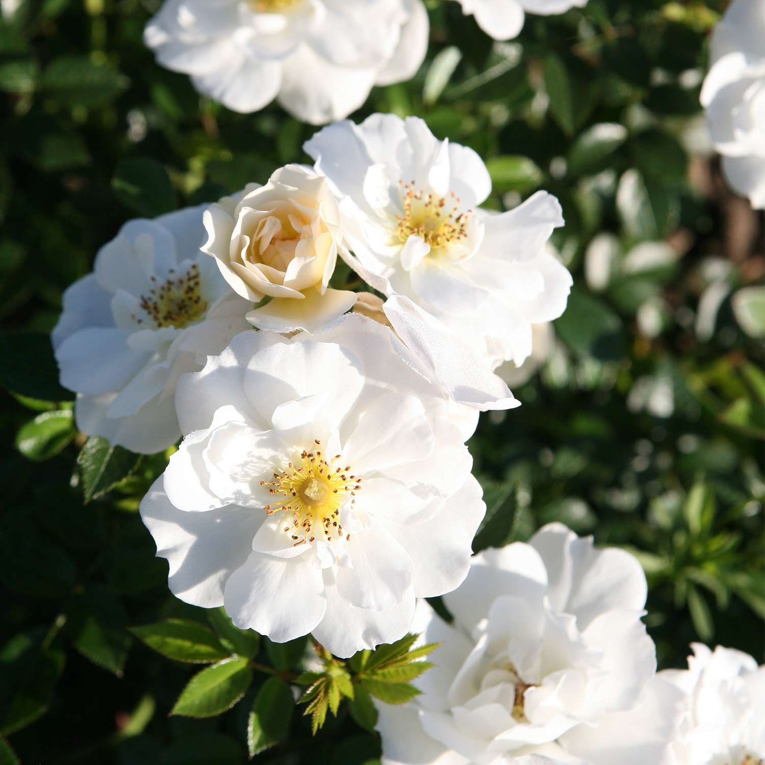 Die Beetrose 'Bienenweide weiß' ist eine verzaubernde Ergänzung für jeden Garten, die mit ihren reinweißen, halbgefüllten Blüten und intensiv gelben Staubgefäßen nicht nur das Auge erfreut, sondern auch Bienen anzieht. Diese Zwergrose ist öfterblühend und zeichnet sich durch eine sehr gute Blattgesundheit sowie Winterhärte aus.