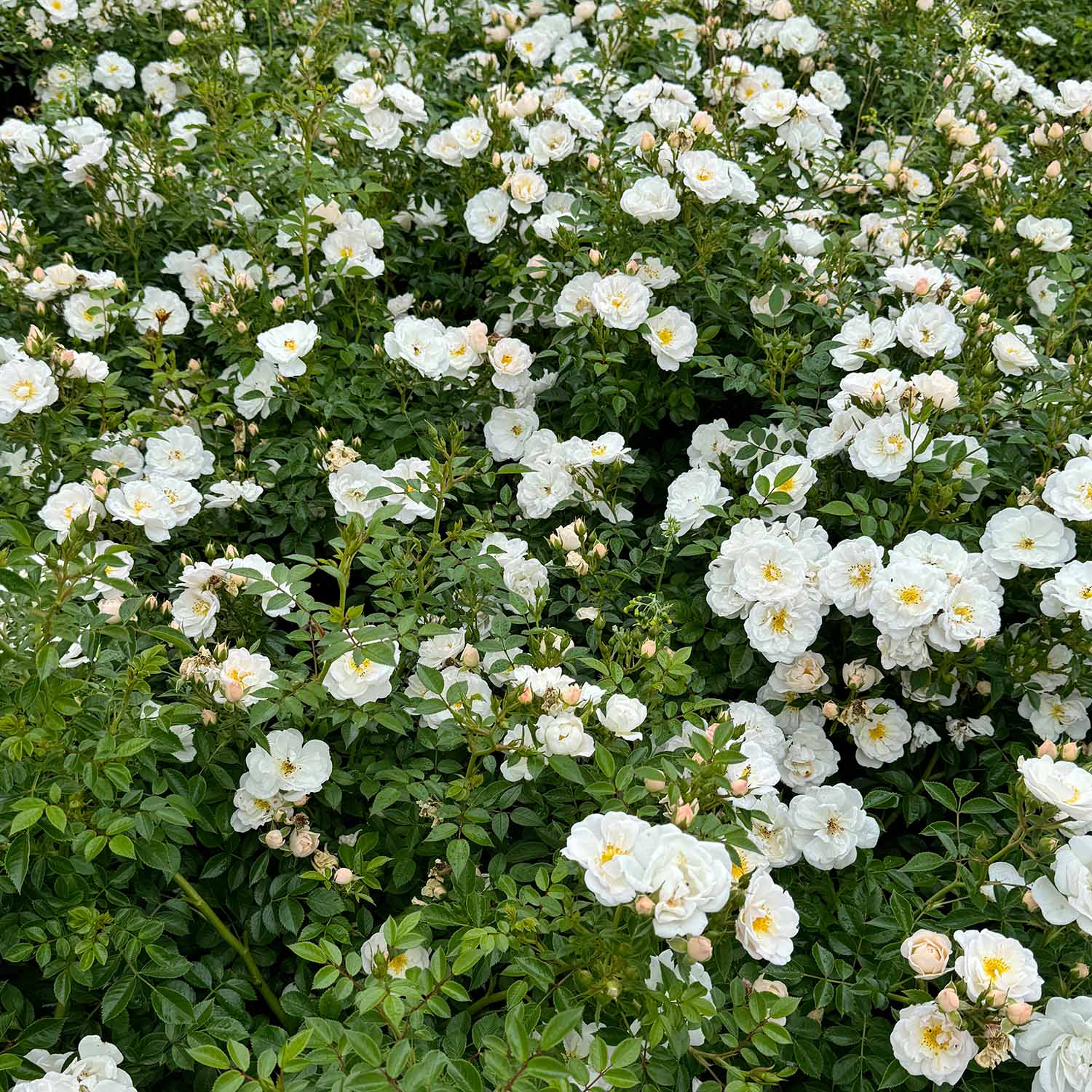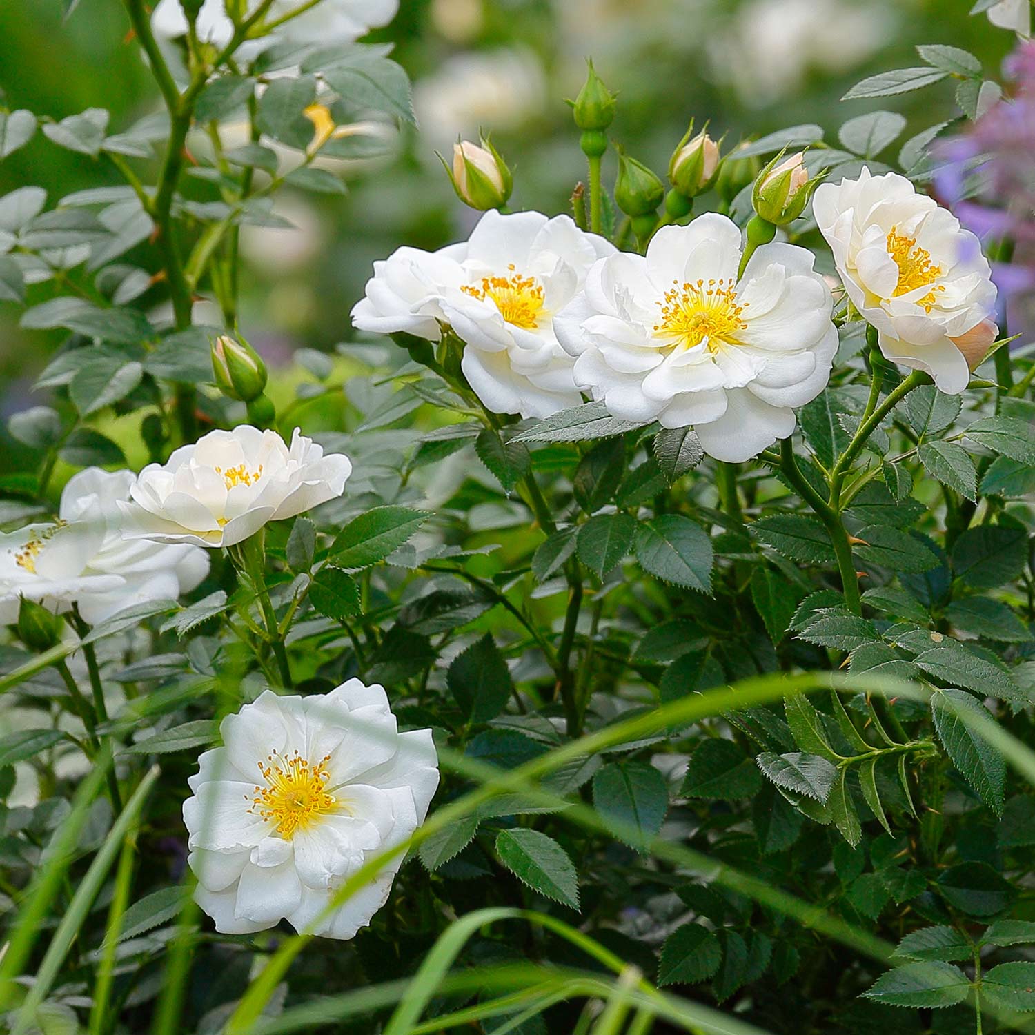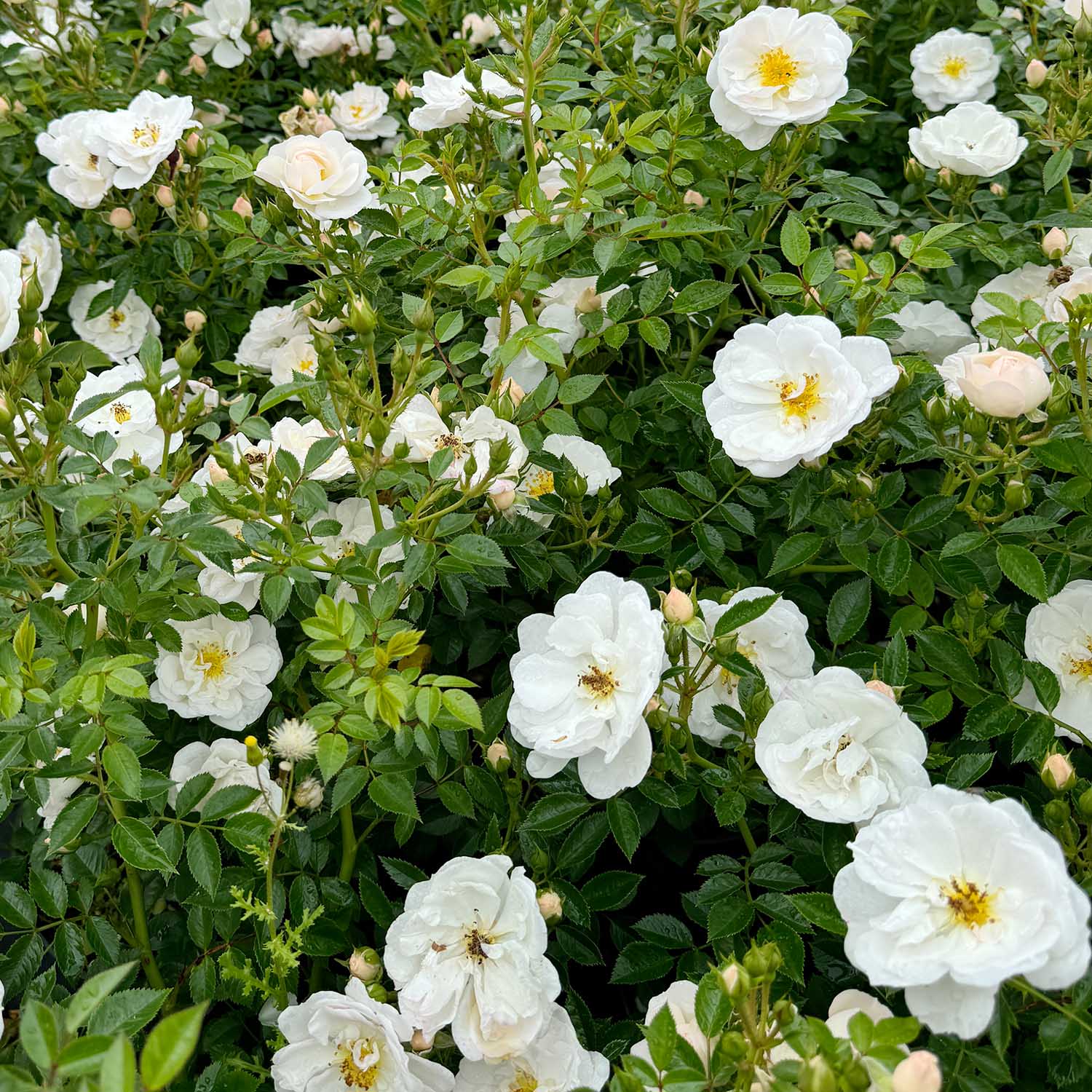 Mit ihrem niedrigen und kompakten Wuchs eignet sich die 'Bienenweide weiß' hervorragend für kleine Rosengruppen in Beeten oder als zierende Pflanze in Töpfen und Kübeln auf Balkonen und Terrassen. Ihre Robustheit und Anpassungsfähigkeit machen sie zu einer idealen Wahl für vielfältige Gartenszenarien.