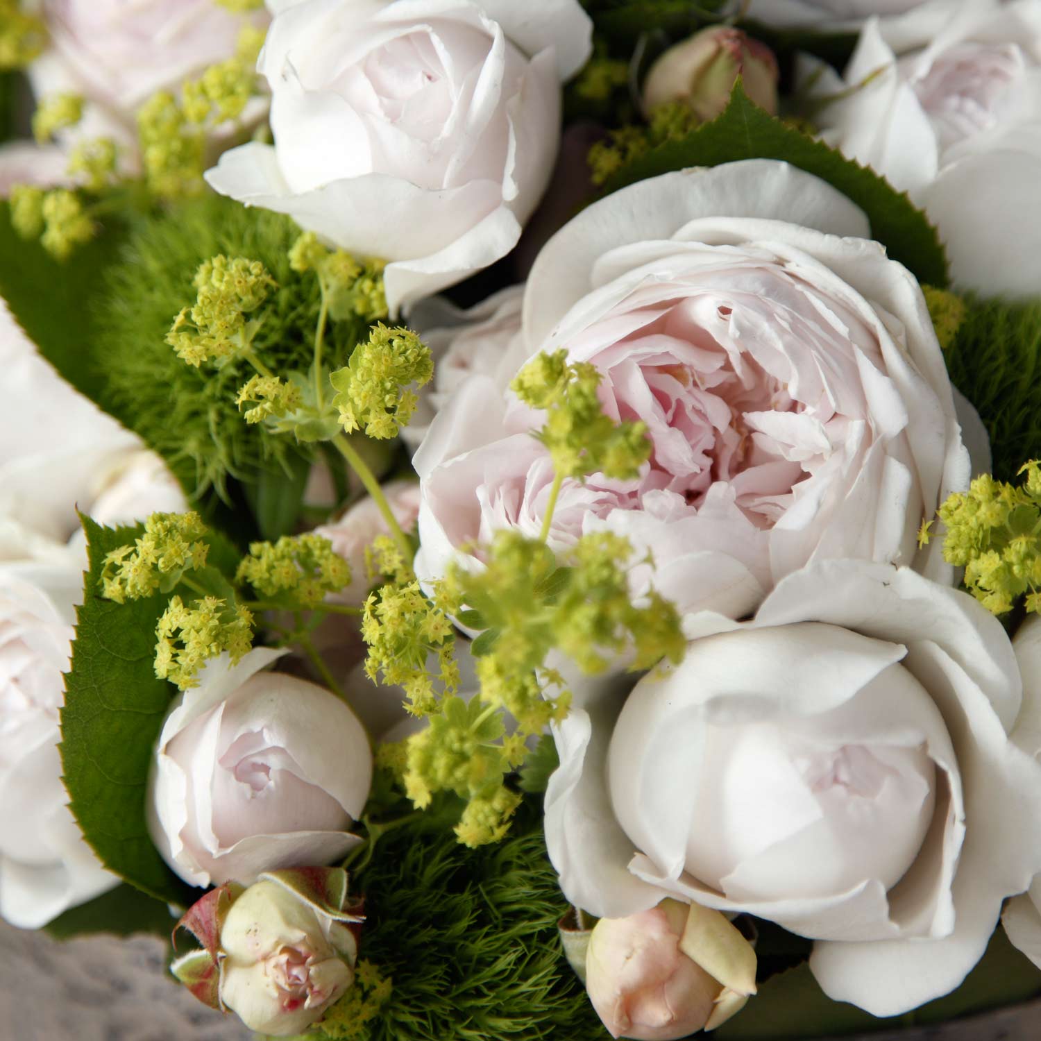 Ihre stark gefüllte Blüte ist cremeweiß mit einem Hauch von zartem Rosa. Sie zeigt sich unermüdlich von Juni bis Oktober.