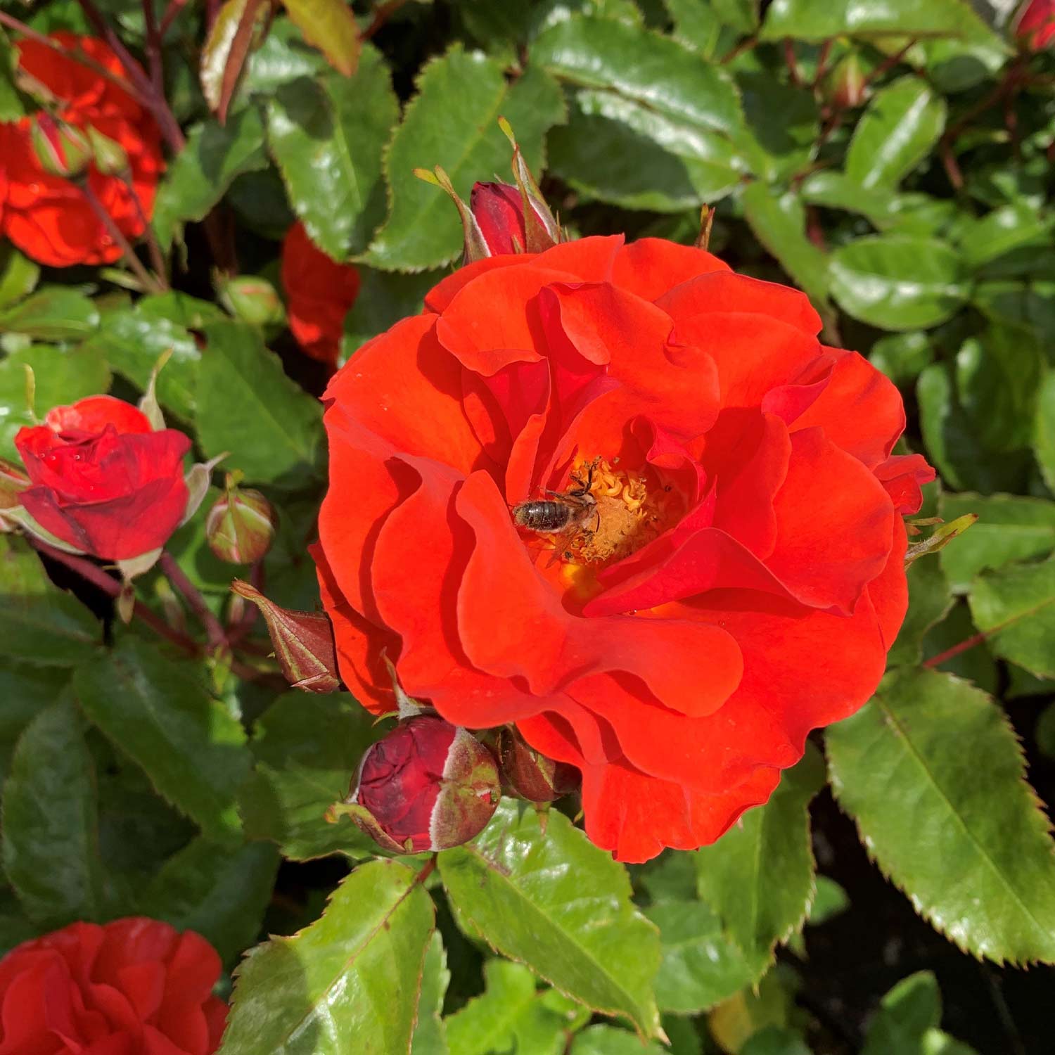 Die Beetrose 'Westpoint®' entfacht ein wahres Leuchtfeuer im Garten. Mit ihrer intensiven blutorangen Blütenfarbe und dem kontrastreichen, dunkelgrünen Laub zieht sie alle Blicke auf sich und verströmt einen leichten, angenehmen Duft.