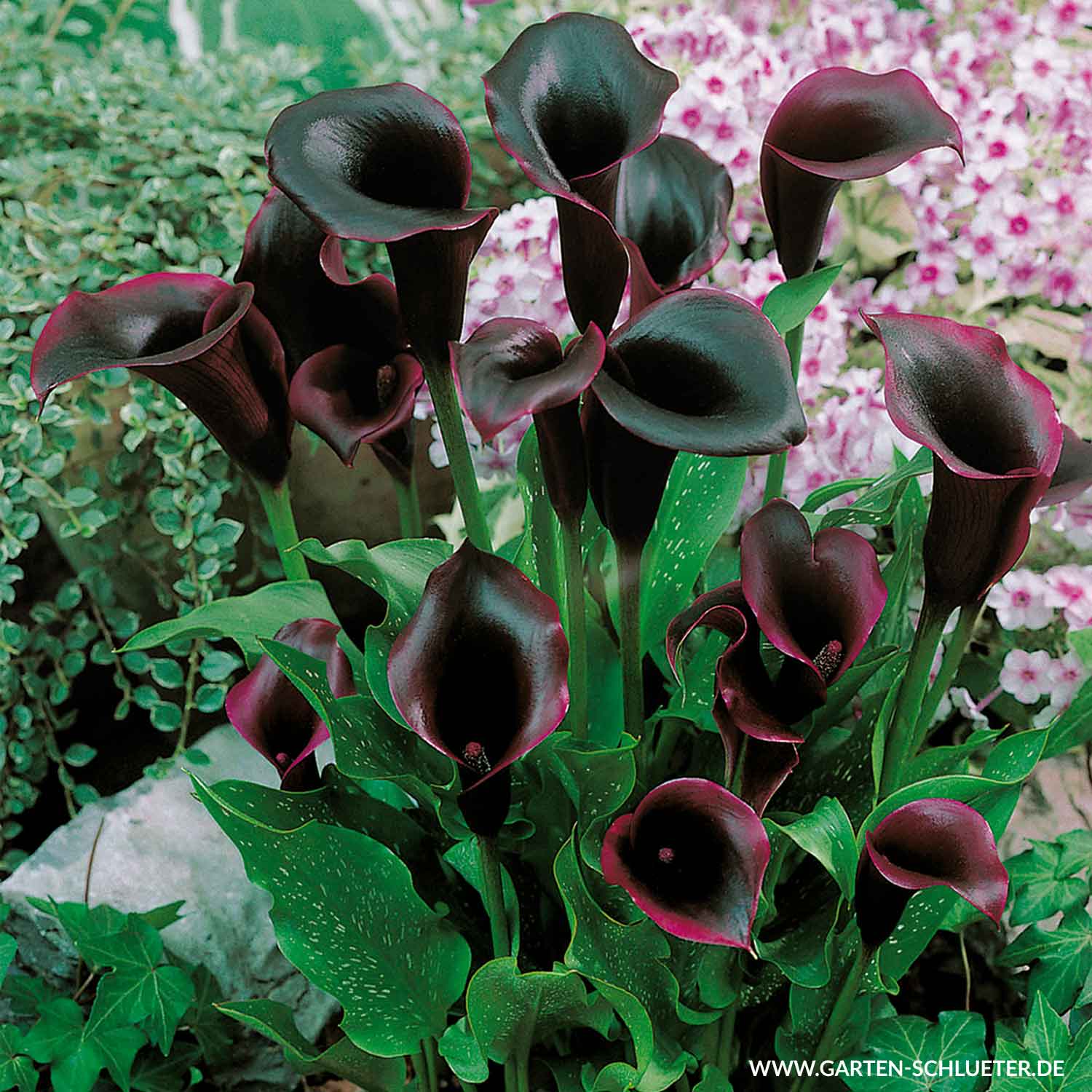 Ihre Blüten sind tief dunkelrot bis schwarz, trichterförmig und elegant. Ihr Blatt ist groß, frischgrün und mit weißer Zeichnung. Die außergewöhnliche Blüte können Sie von Juni bis November in Ihrem Garten betrachten. Die Wuchshöhe der 'Odessa' beträgt. 30 – 80 cm.