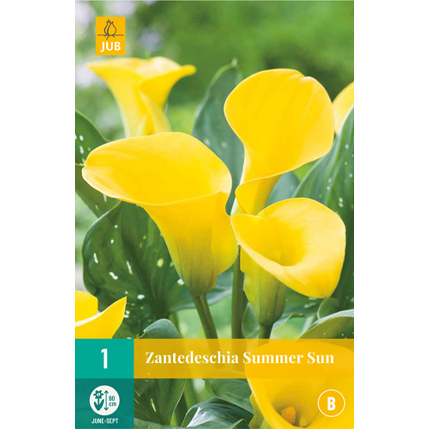Die Calla ‚Summer Sun‘ fällt an jedem Standort durch ihre großen und hell leuchtenden Blüten auf. Dennoch verleiht die trichterförmige Art der Blüte ihr die gewisse Eleganz, um sie auch als zeitlose Dekoration im Haus einsetzen zu können.