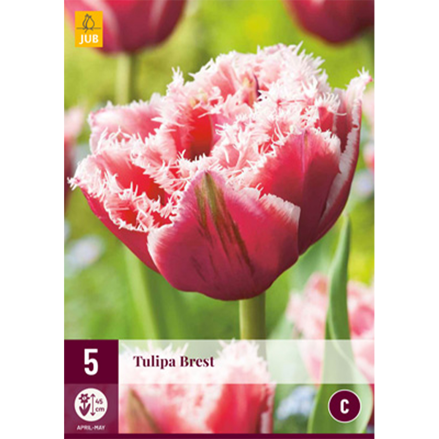 Die Gefranste Tulpe "Brest" verzaubert uns mit ihren zweifarbigen, großen Blüten. Sie sind gefranst, rosarot und haben einen hellen Rand. Diese Tulpe wird zwischen 40 und 50 cm hoch und ist außerdem als Schnittblume verwendbar.