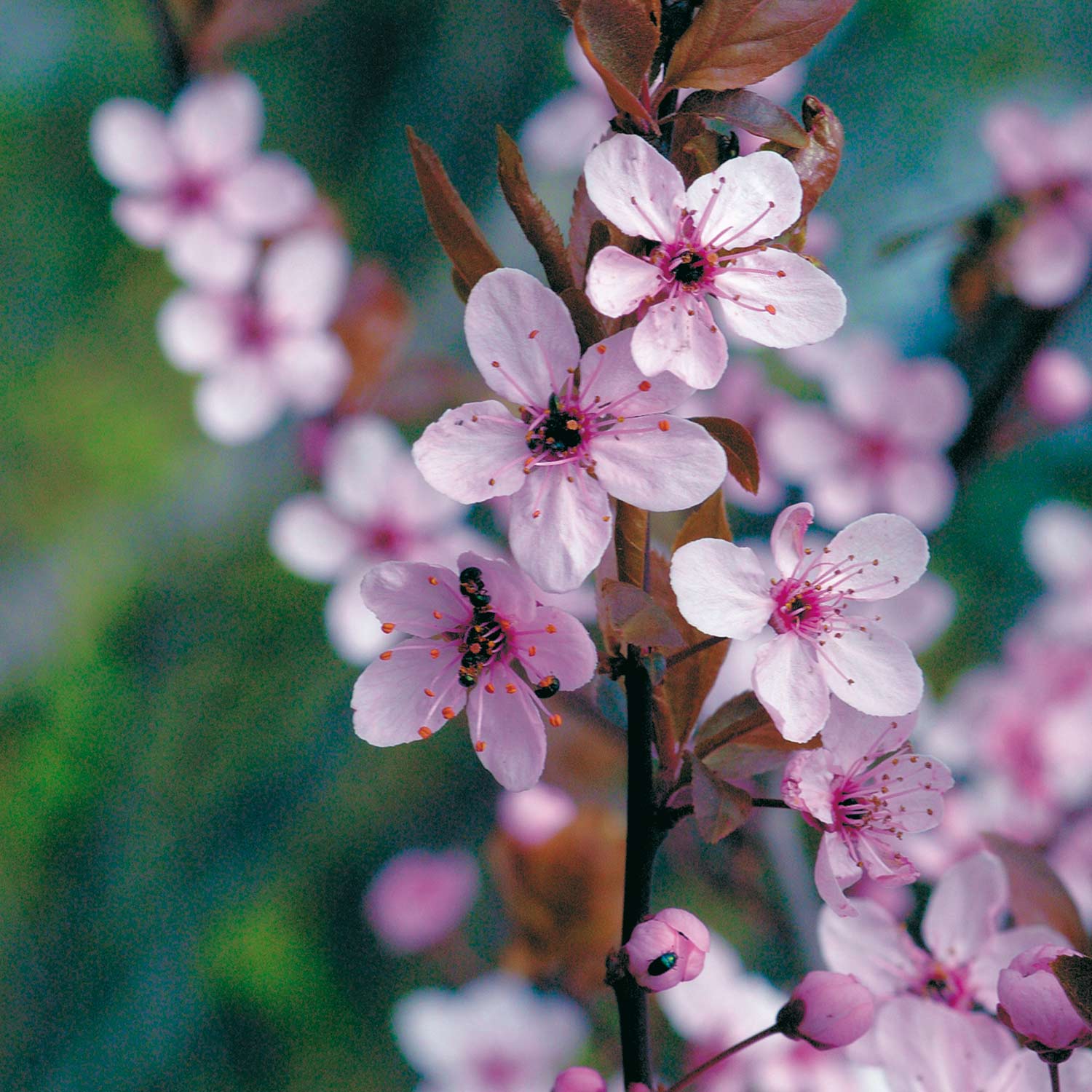 Das braunrote Laub der Blutpflaume bietet einen ganz tollen Kontrast zu anderen grünen Laubgehölzen. Die rosafarbenen Blüten leuchten ab April in einer unendlich Vielzahl. Im Herbst trägt die Blutpflaume dann ihre dunkelroten, 2-3 cm dicken, sehr saftig-süß schmeckenden Pflaumen.