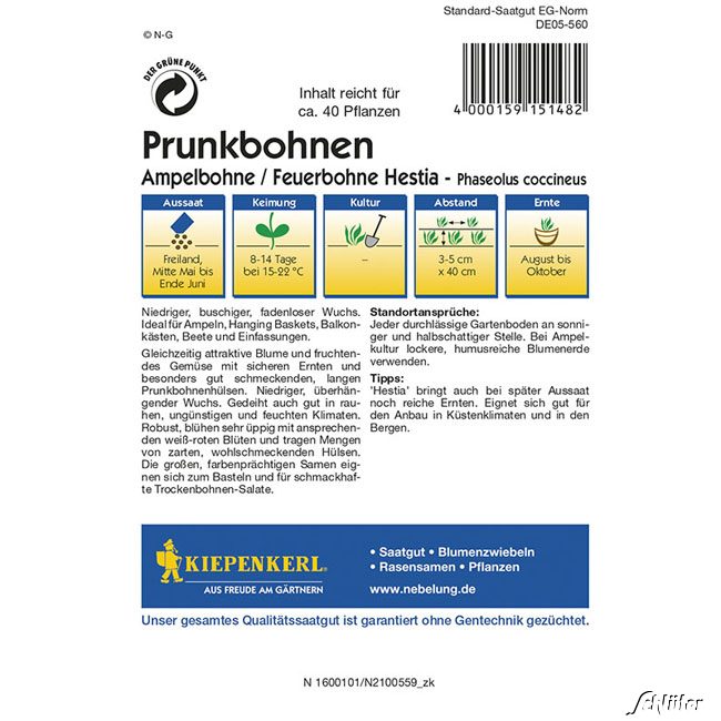 "Hestia" hat neben sehr gut schmeckenden, langen Prunkbohnenhülsen auch wunderschöne Blüten vorzuweisen, die üppig zweifarbig rot und weiß blühen. Sie sind äußerst robust, gedeihen also auch in rauen, ungünstigen und feuchten Gegenden.