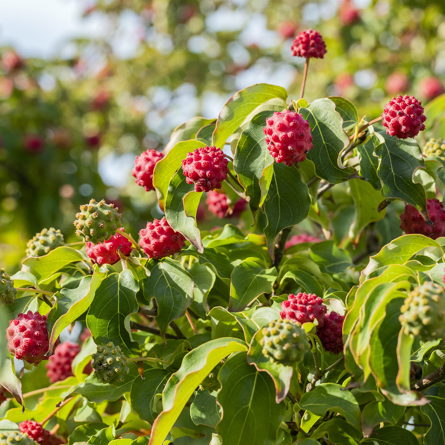 Der Chinesische Blumen-Hartriegel 'Milky Way' ist eine reichblühende Züchung, die ihre cremeweißen Blüten zwischen Mai und Juni trägt. In den Herbstmonaten zeigen sich anstelle der Blüten viele rosarote an Himbeeren erinnernde Früchte.