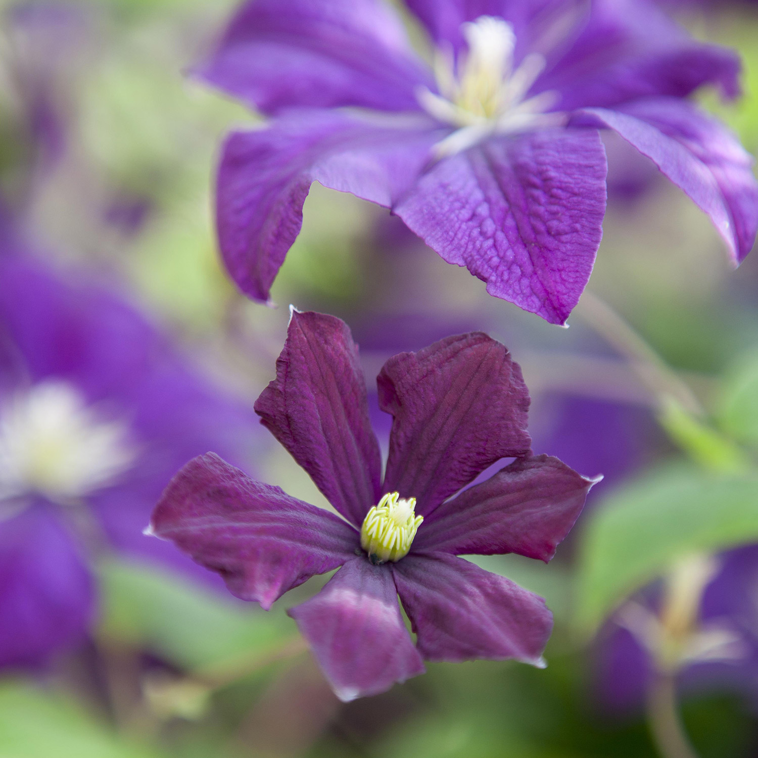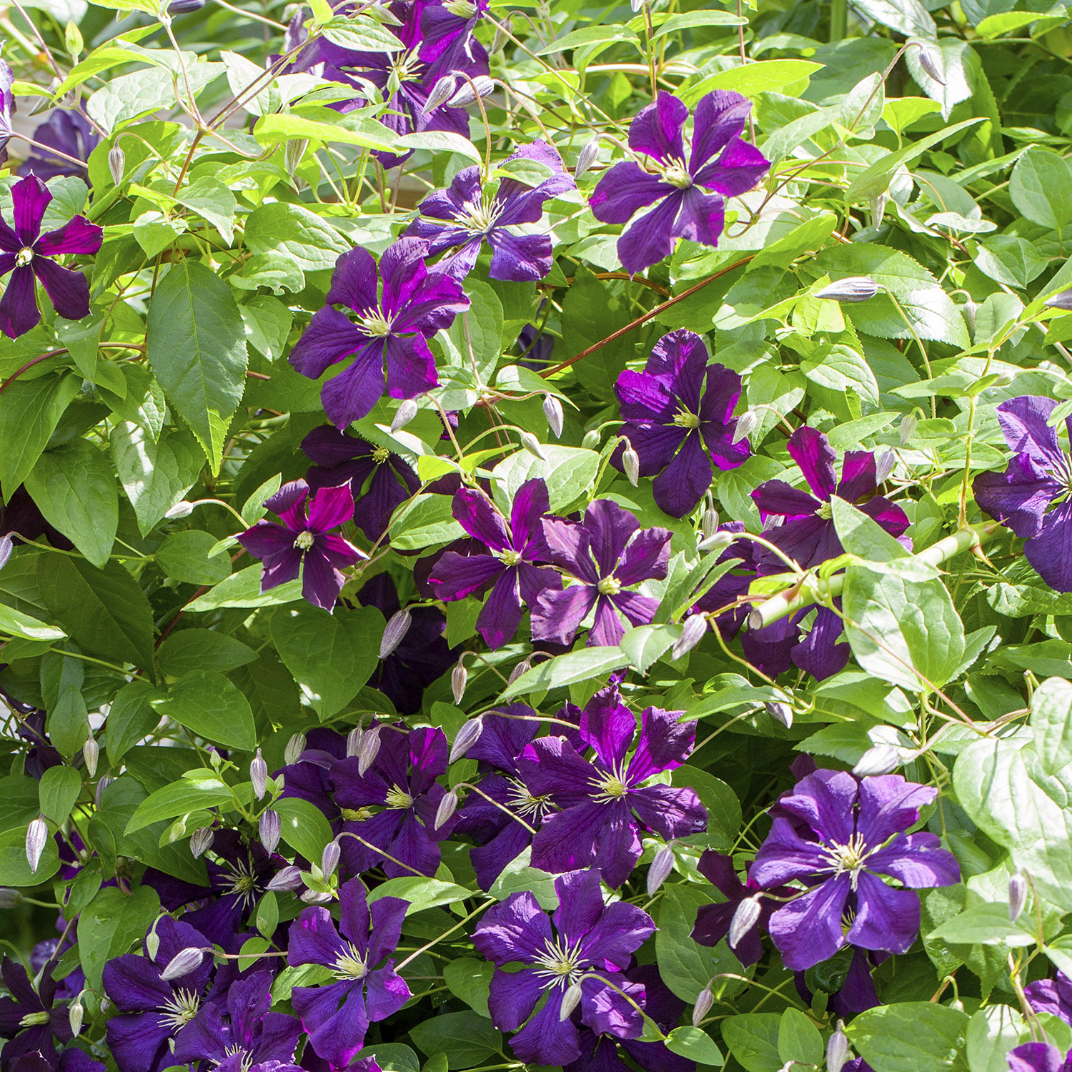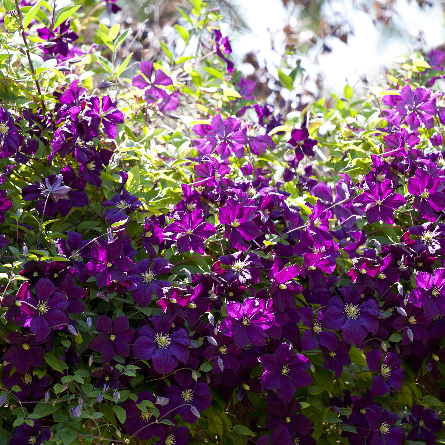 Im März empfehlen wir einen Rückschnitt auf 30 - 50 cm. Die Blüten der Clematis "Etoile Violette" blühen am Neuholz.