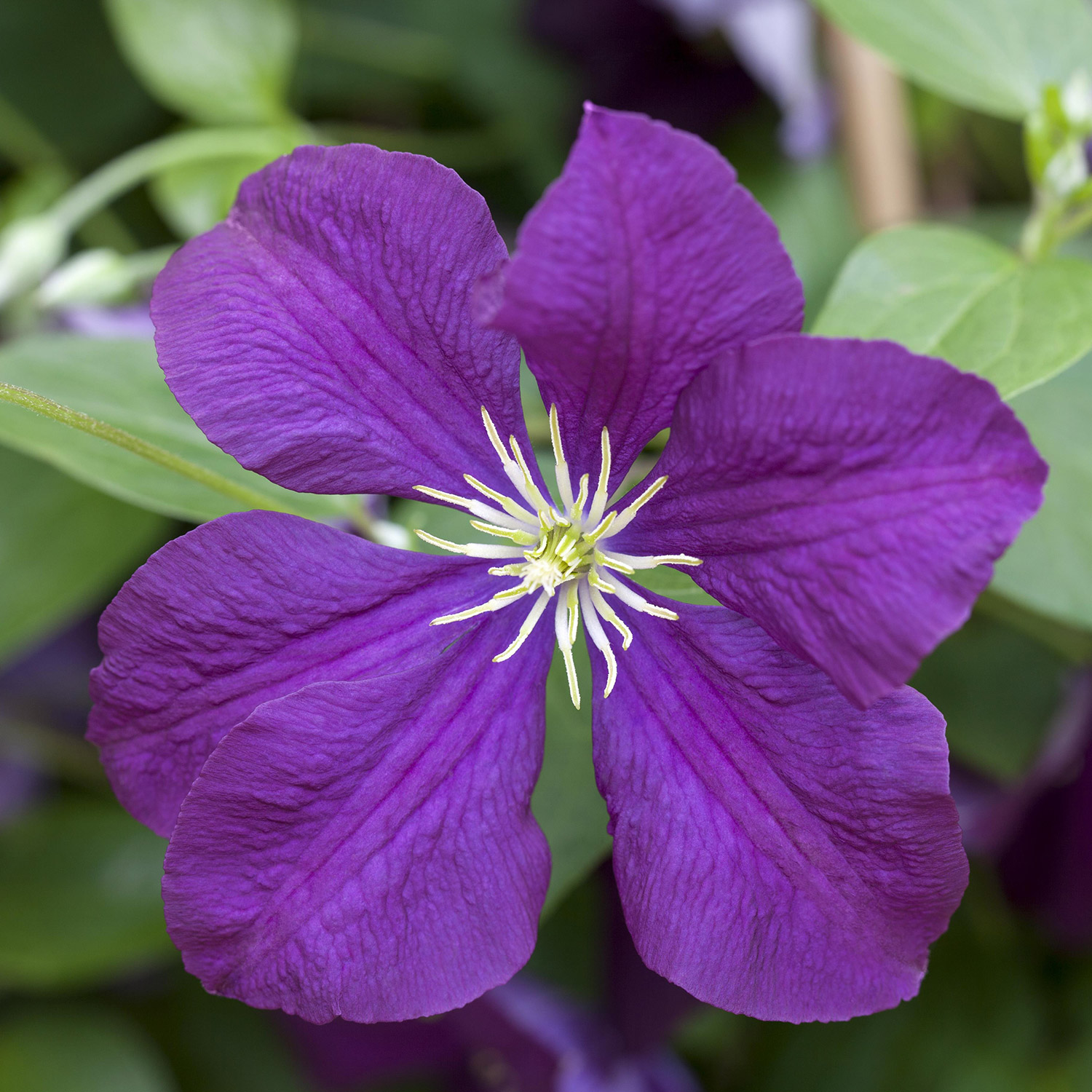 Die Blüten dieser Clematis leuchten in einem herrlich intensiven blauviolett und sind ca. 5-10 cm groß. Sie sind durchzogen von sehr feinen karminroten Streifen und haben eine samtige Oberfläche, von der sich helle Staubgefäße konstrastreich abzeichnen.