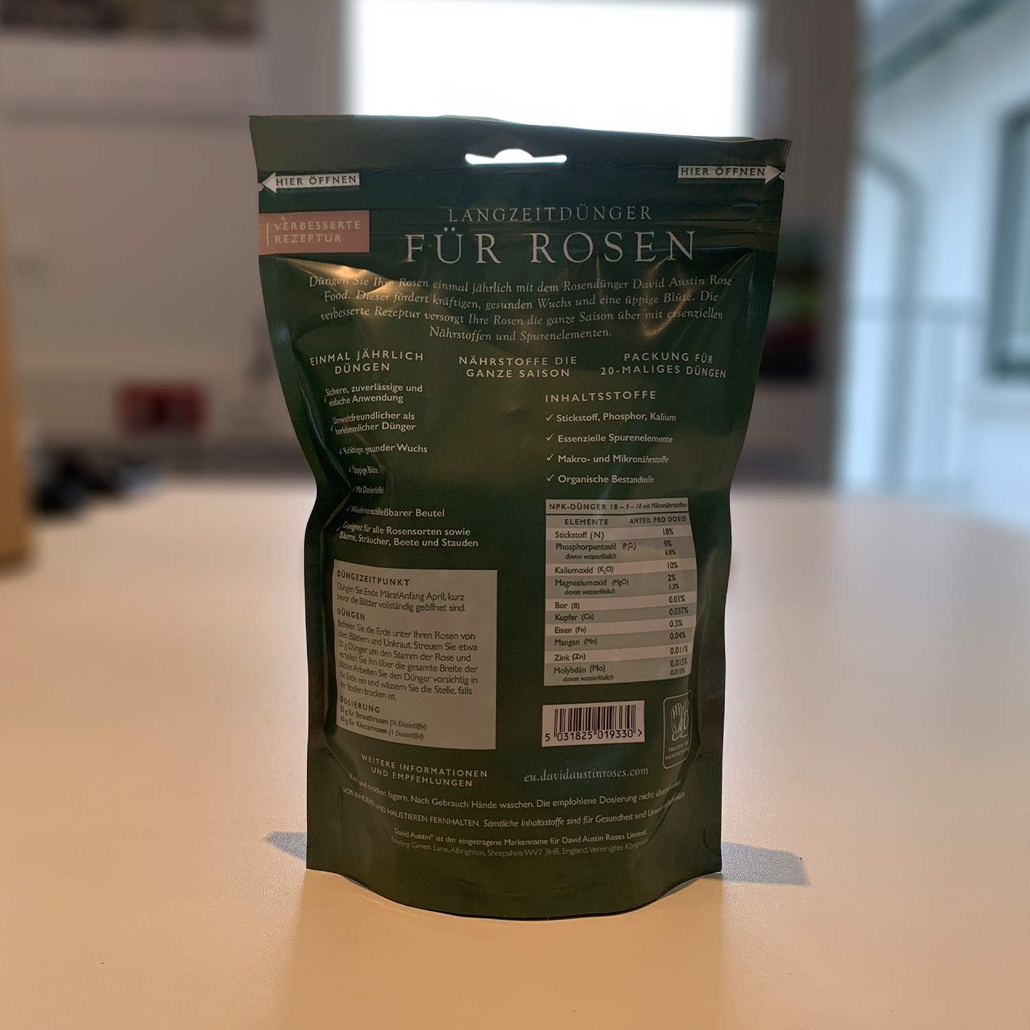 Der Rosendünger 'Rose Food' von David Austin ist die ideale Wahl für alle, die ihre Rosen mit dem Besten versorgen möchten, ohne dabei die Umwelt zu belasten. Erleben Sie den Unterschied und genießen Sie gesunde, blühende Rosen die ganze Saison über.