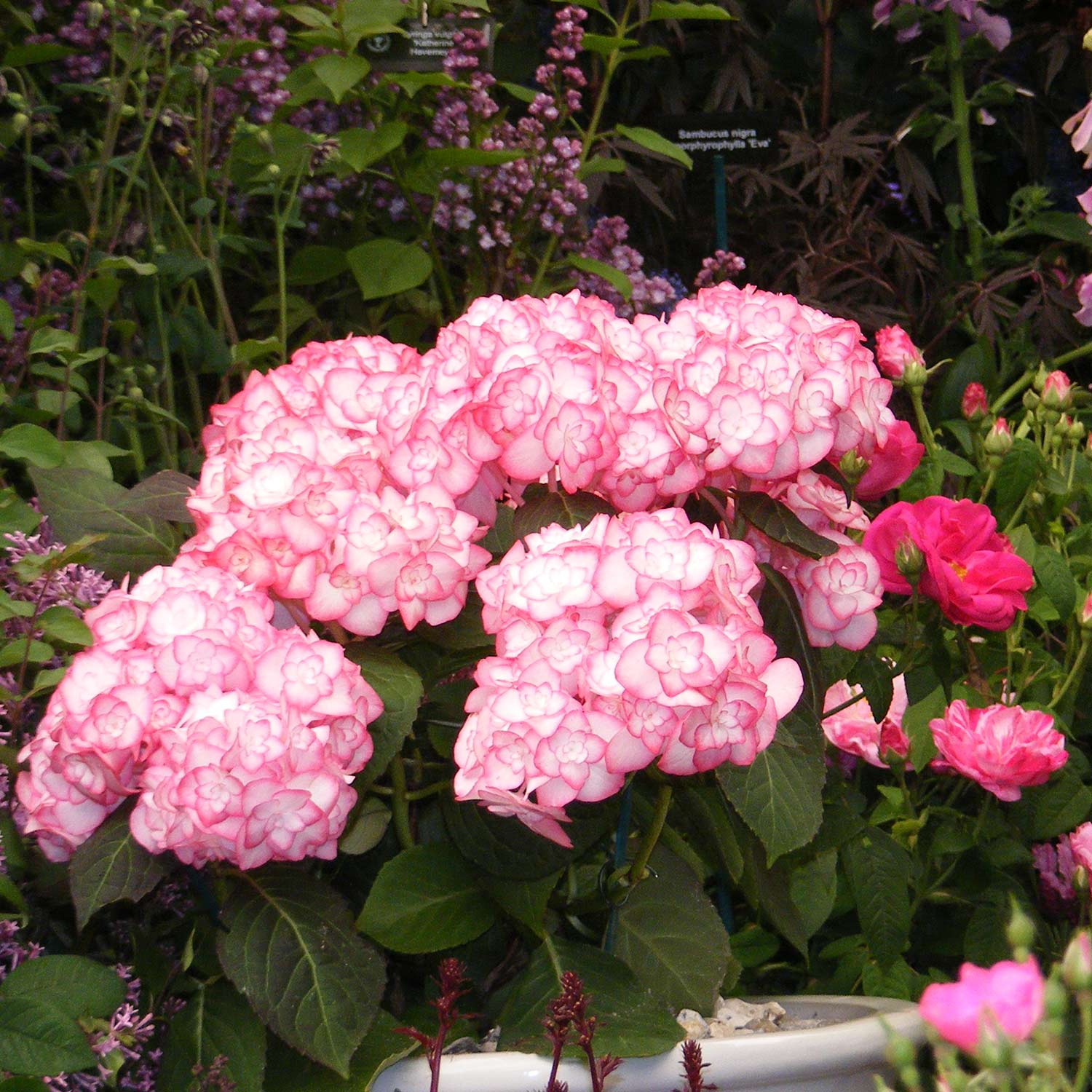 Die Gartenhortensie Miss Saori® (Hydrangea macrophylla Miss Saori) besitzt doppelt gefüllte Blüten mit einer weißen Mitte und einem pinkfarbenen Rand, der zur Mitte hin verläuft. Sie besitzt Neuheits- und Seltenheitswert hat und bildet einen wunderbaren Kontrast zum dunklen Laub. Im Frühjahr und Herbst zeigt dieses sich dunkelgrün bis bordeauxfarben. Diese Hortensiesorte wurde in Japan von Ryoji Irie gezüchtet, der sie nach seiner Frau benannte. Besonderheit: Auf der RHS Chelsea-Flower-Show 2014 wurde sie Gewinnerin unter 40 Anmeldungen, als "2014 Chelsea Plant of the Year" ausgezeichnet und erhielt eine Goldmedaille.