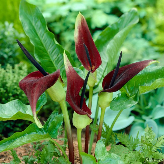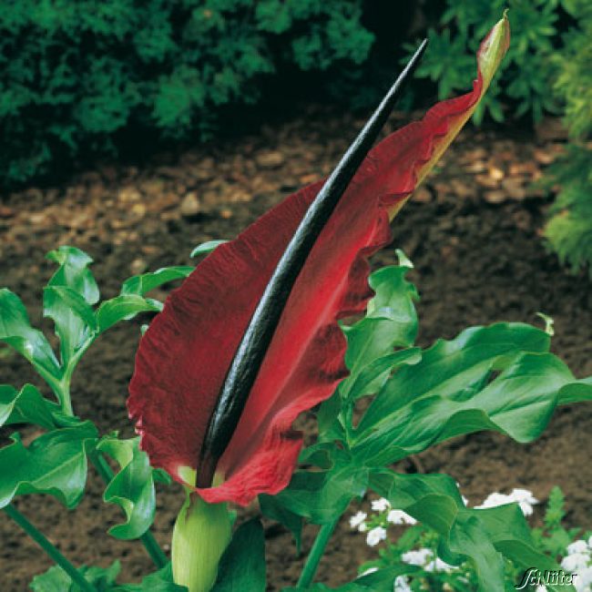 Drachenwurz ist eine ganz besondere Pflanze, die genau das Richtige ist, wenn Sie etwas außergewöhnliches für Ihren Garten suchen. Die dunkelrote Blüte steht auf einem kräftigen Stiel und ist geformt wie ein großes, längliches Blatt. Aus dem Stiel kommt außerdem ein zweiter, langer und schwarzer Stiel. Der Drachenwurz verdankt seinen Namen dem feurigen Aussehen.