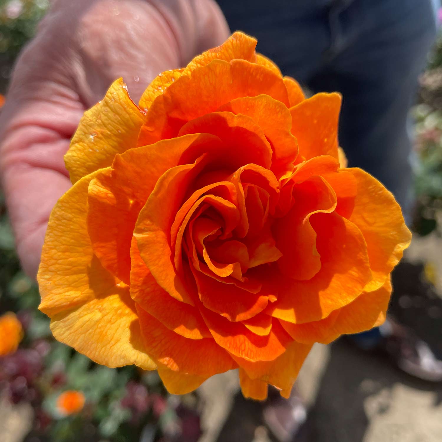 Ihre Blüten leuchten in einem warmem Kupfergold-orange, dass sich je nach Jahreszeit und Temperatur auch in ein Hellorange-rosé verwandeln kann. Die Blüten sind eindrucksvoll gefüllt. Auch das Blatt ist ser gesund.