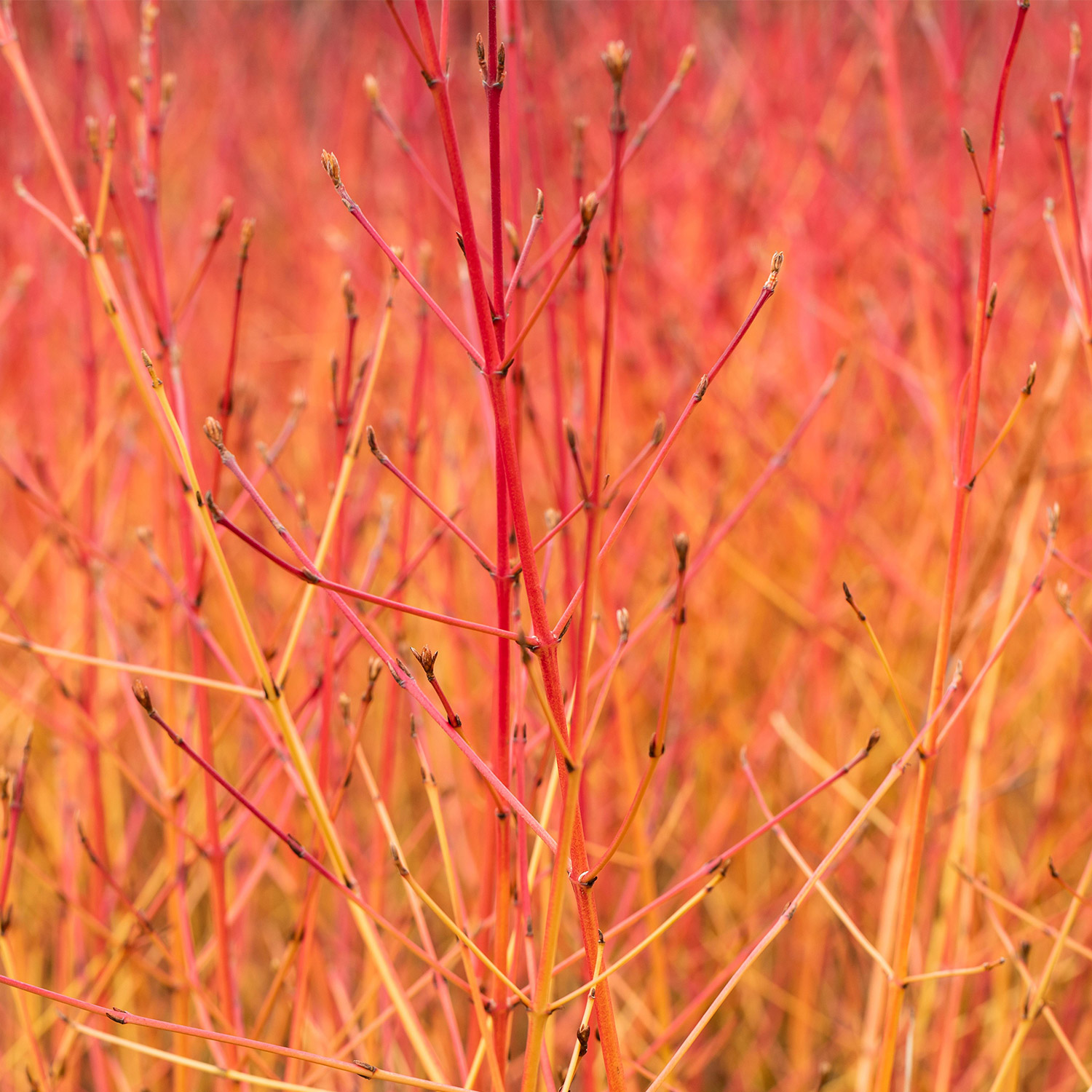 Im Herbst verzaubert 'Midwinter Fire' mit seiner leuchtend roten Blattfarbe, die in Gelborange übergehen kann. Doch besonders im Winter, wenn der Garten zur Ruhe kommt, entfaltet der Strauch seine ganze Pracht und wärmt optisch an den kältesten Tagen.