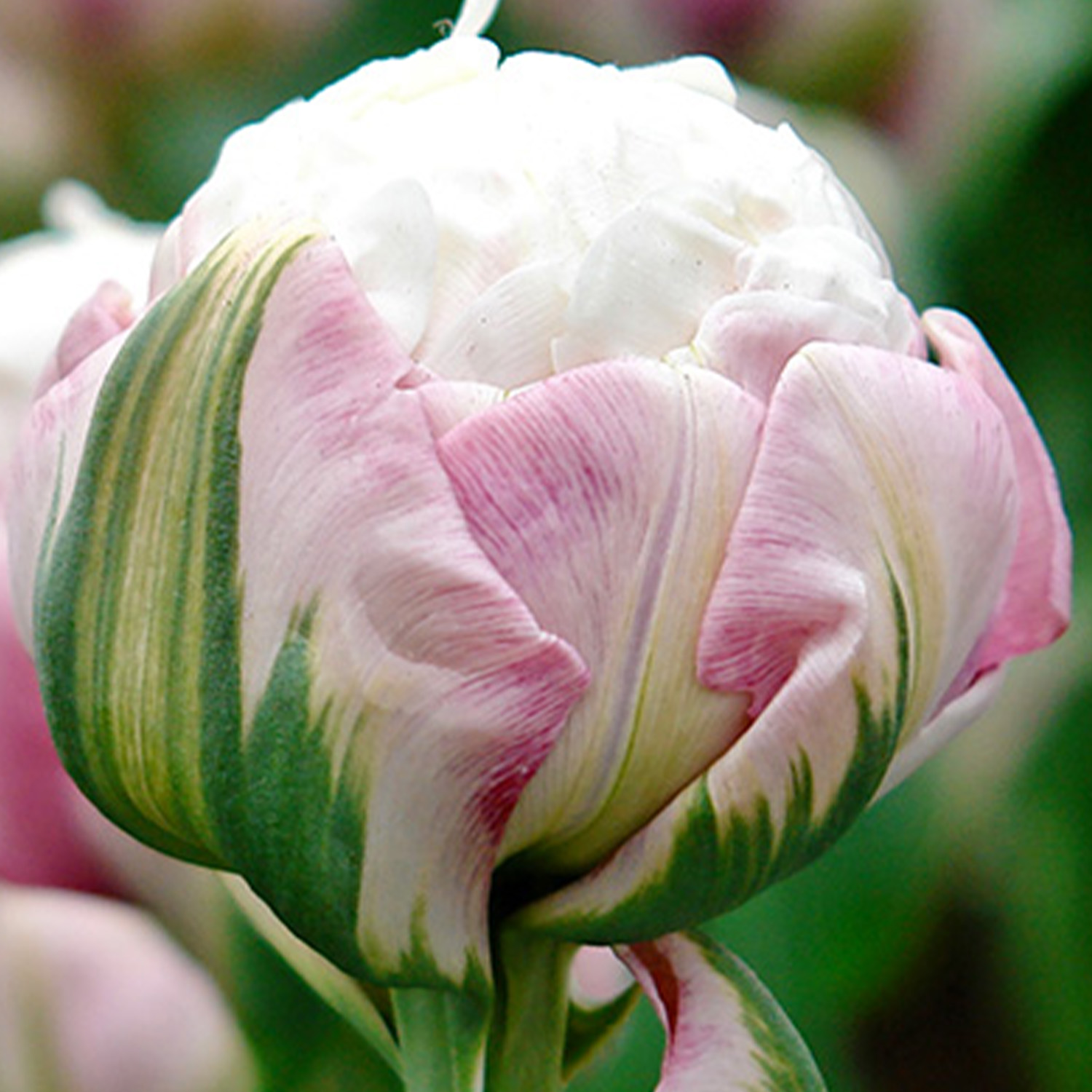 Hochgewachsene, dicht gefüllte weiße Blütenblätter werden von kürzeren pinken Blütenblättern eingerahmt, die einen grünen Mittelstreifen besitzen und der Tulpenblüte damit ein noch interessanteres Aussehen verleiht.