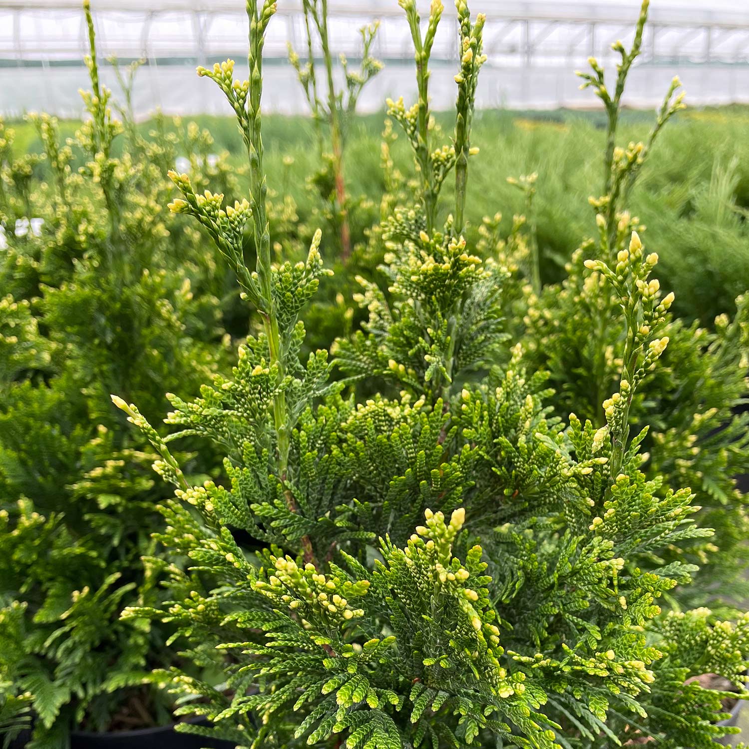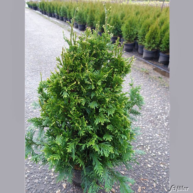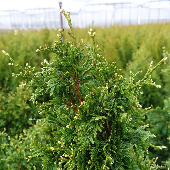 Bei dieser neuen Thujasorte handelt es sich um eine schöne, kompakte und langsam wachsende Züchtung. Die Nadeln der Konifere sind dunkelgrün, neue Treibe weisen leuchtend gelbe Spitzen auf. Dieses Farbenspiel macht sie optisch sehr interessant. Sie erreicht eine Wuchshöhe von 2 bis 3 m und ist immergrün. Durch den kompakten Wuchs ist die Pflanze auch für Vorgärten, Gräber, kleine Gärten sowie für Kübel geeignet. Lebensbäume sind eine Pflanzengattung aus der Familie der Zypressengewächse und eine bekannte Heckenpflanze mit gegenständigen, schuppenförmigen Blättern.
