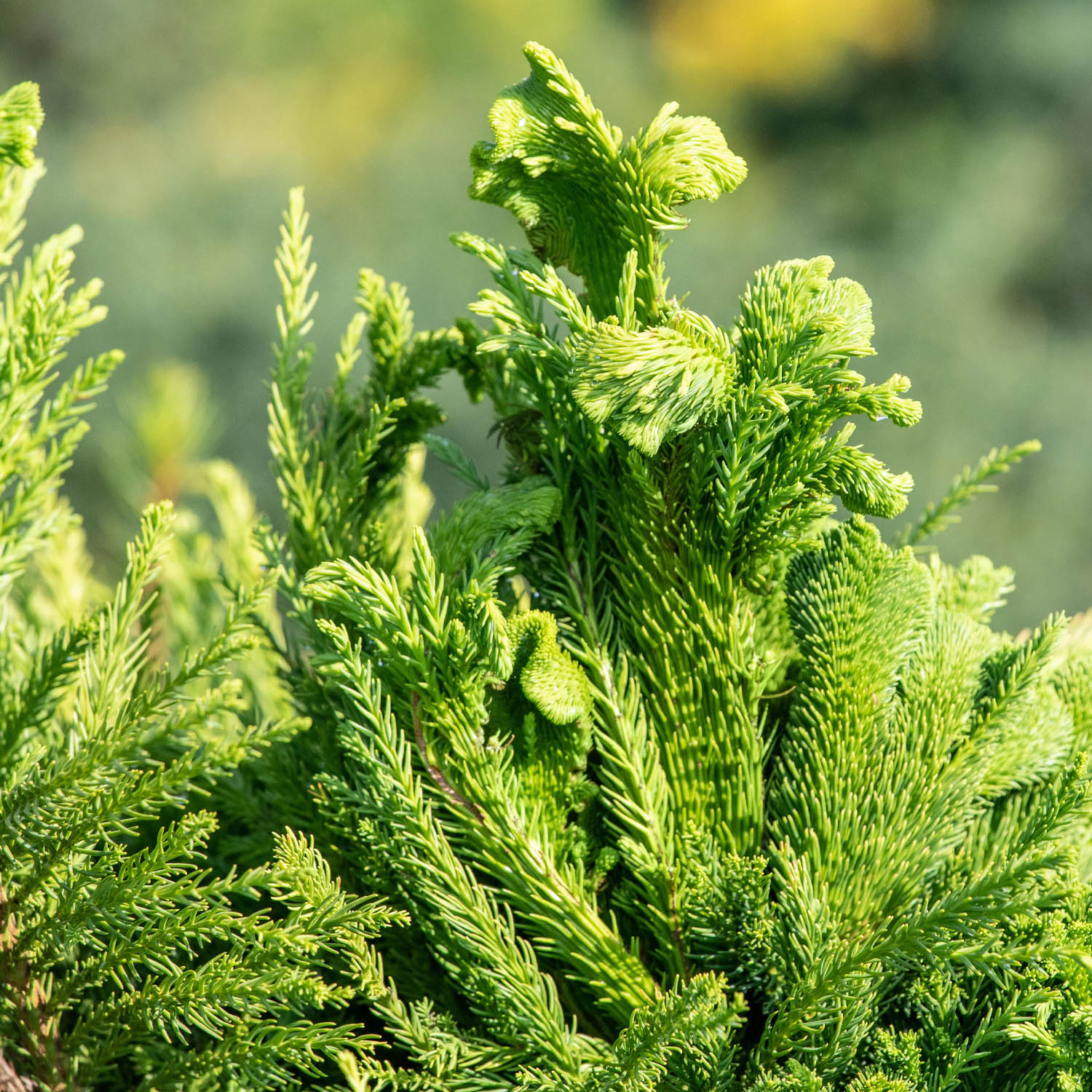 Die Hahnenkamm-Sicheltanne 'Cristata' (Cryptomeria japonica 'Cristata') ist eine der außergewöhnlichsten Koniferen aus den fernöstlichen Regionen Chinas und Japans. Mit ihrem immergrünen Farbkleid und den charakteristisch verdrehten Trieben, die an einen Hahnenkamm erinnern, stellt sie eine absolute Bereicherung für jeden Garten dar. Ihre unverwechselbare Erscheinung macht sie zu einem exotischen Eyecatcher in jedem Vorgarten und setzt markante Akzente in der Gartengestaltung.