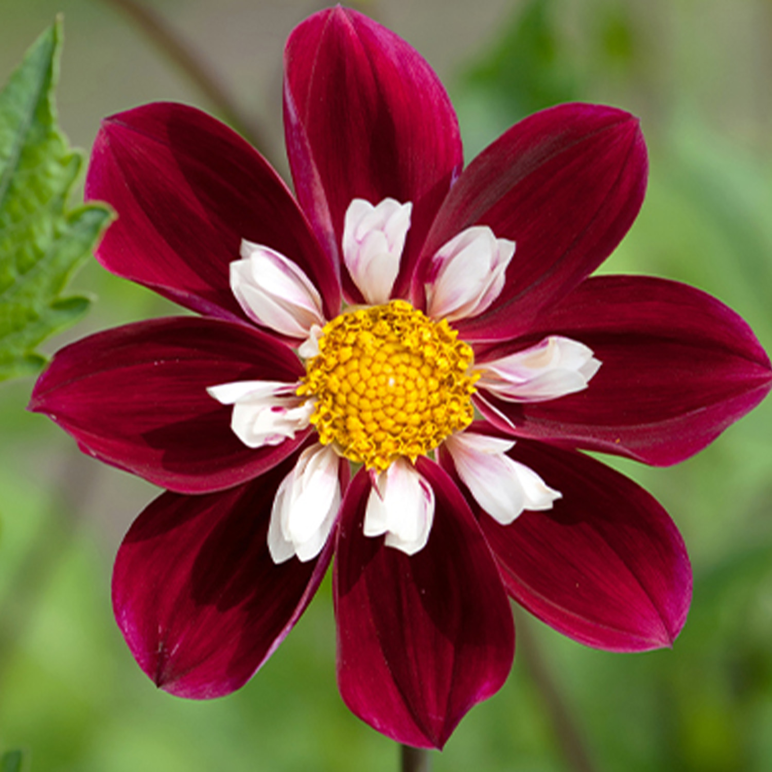 - innere, weiße Blütenblätter sitzen direkt auf den größeren, tief weinroten, äußeren Blütenblättern, starker Kontrast zum Gelb des Stempels