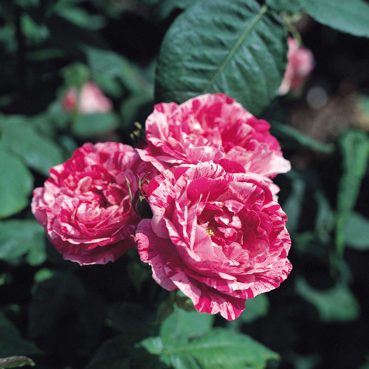Die historische Rose "Ferdinand Pichard" ist eine der edelsten gestreiften Rosen, die öfterblühend ist. Ihre Blüten erfreuen uns mit rosa, karmesinroten und purpurnen Streifen und verströmen einen starken, vollen Duft. Die Form der Blüten ist kugelig und gut gefüllt, sie wachsen in Büscheln. Das Blattwerk der "Ferdinan Pichard" ist glänzend, mittelgrün und ledrig.