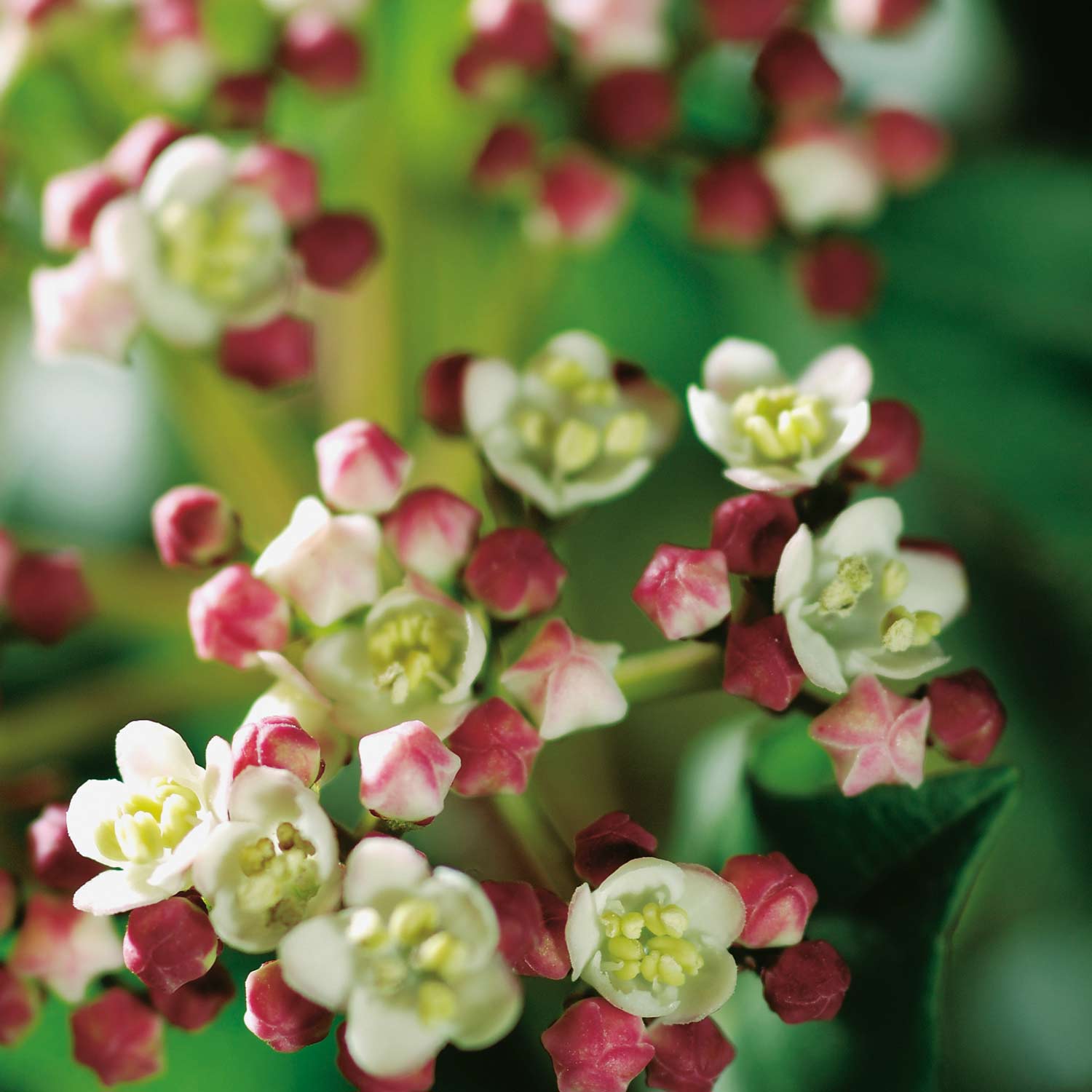 Der Immergrüne Winterschneeball 'Gwenllian' ist ein außergewöhnliches Laubgehölz, das mit seiner langen Blütezeit und den attraktiven, duftenden Blüten jeden Garten bereichert. Von November bis April öffnen sich die rotbraunen Knospen zu weißen, später rosa Blüten, die einen angenehmen Duft verströmen.
