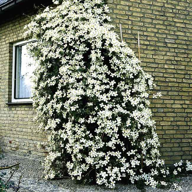 Von Mai bis Juni ist die starkwachsende Kletterpflanze von vielen weißen, meist 4-blättrigen Blüten übersät. Sie wird 8-12Meter hoch und ist so ideal geeignet zum Beranken von hohen Zäunen, Rankgerüsten usw.