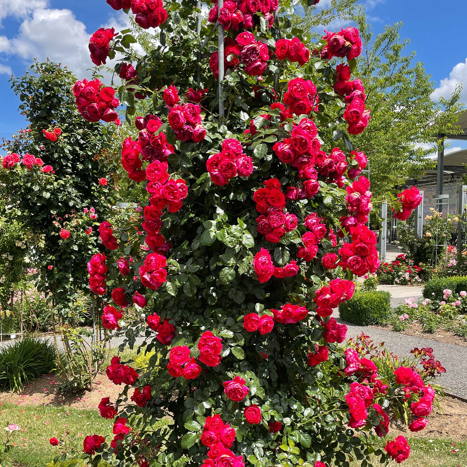 Die mehrfach ausgezeichnete Kletterrose Klettermaxe® 'Florentina' ® zieht alle Blicke auf sich und betört mit leuchtend roten, dicht gefüllten Blüten von Juni bis September.