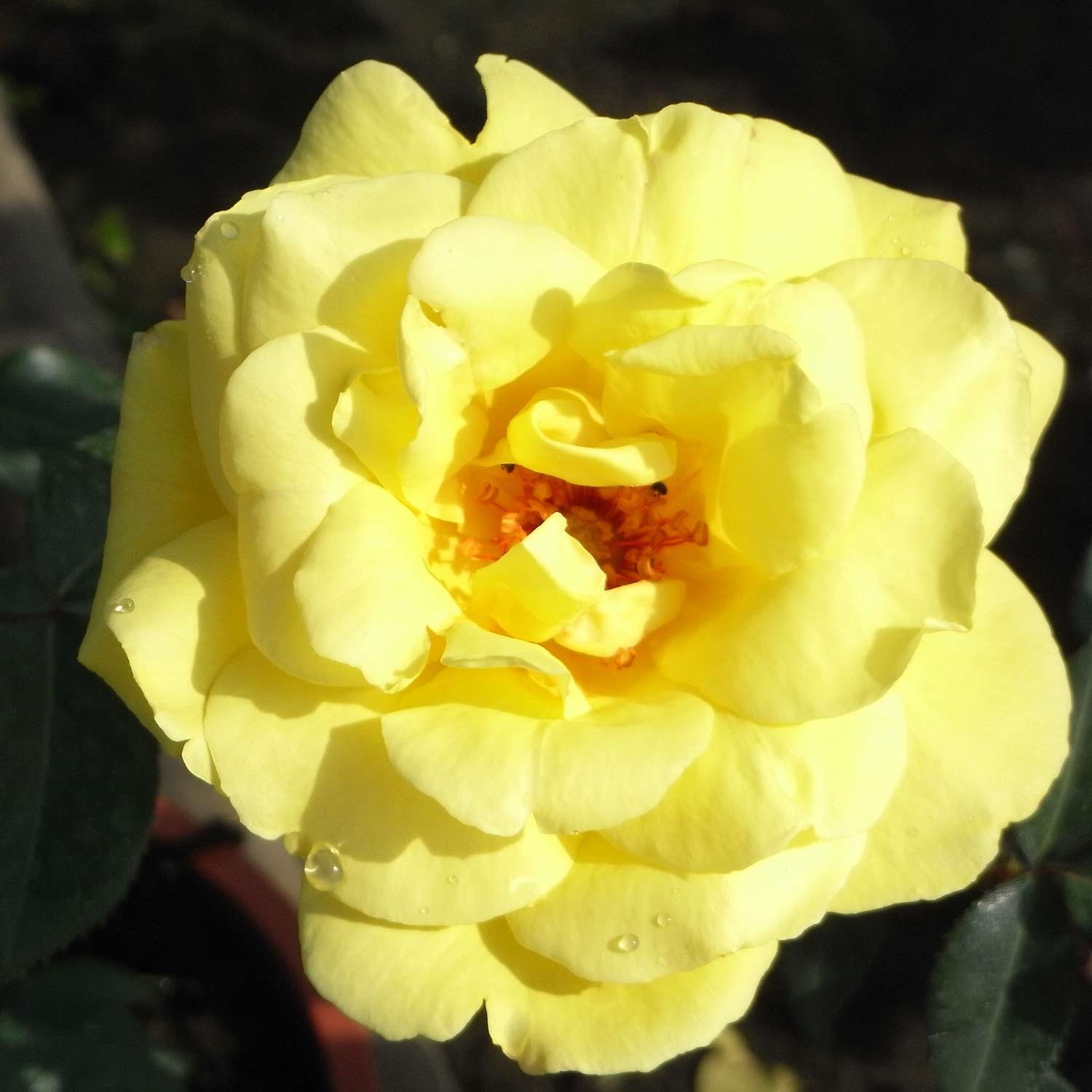 Die gelben Blüten der Kletterrose "Golden Showers®" sind halbgefüllt und man kann die hübschen orangen Staubgefäße gut erkennen. Sie blühen unaufhörlich und verblassen beim Verblühen nur mäßig.