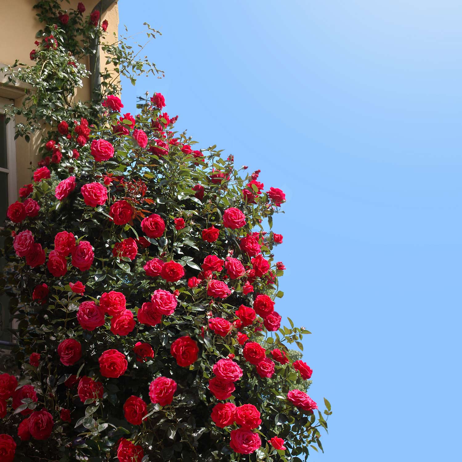 Die 'Red Flame®' ist nicht nur für ihre Schönheit bekannt, sondern auch für ihre Robustheit. Sie wächst kräftig und gesund, was sie zu einer idealen Wahl für Pergolen, Zäune und andere Kletterhilfen macht.