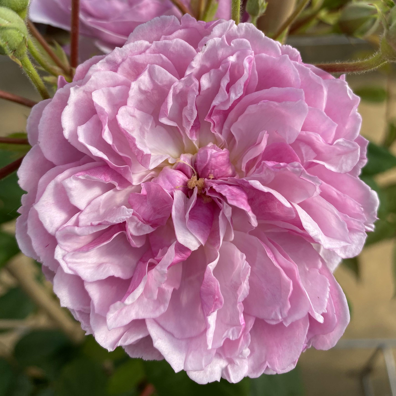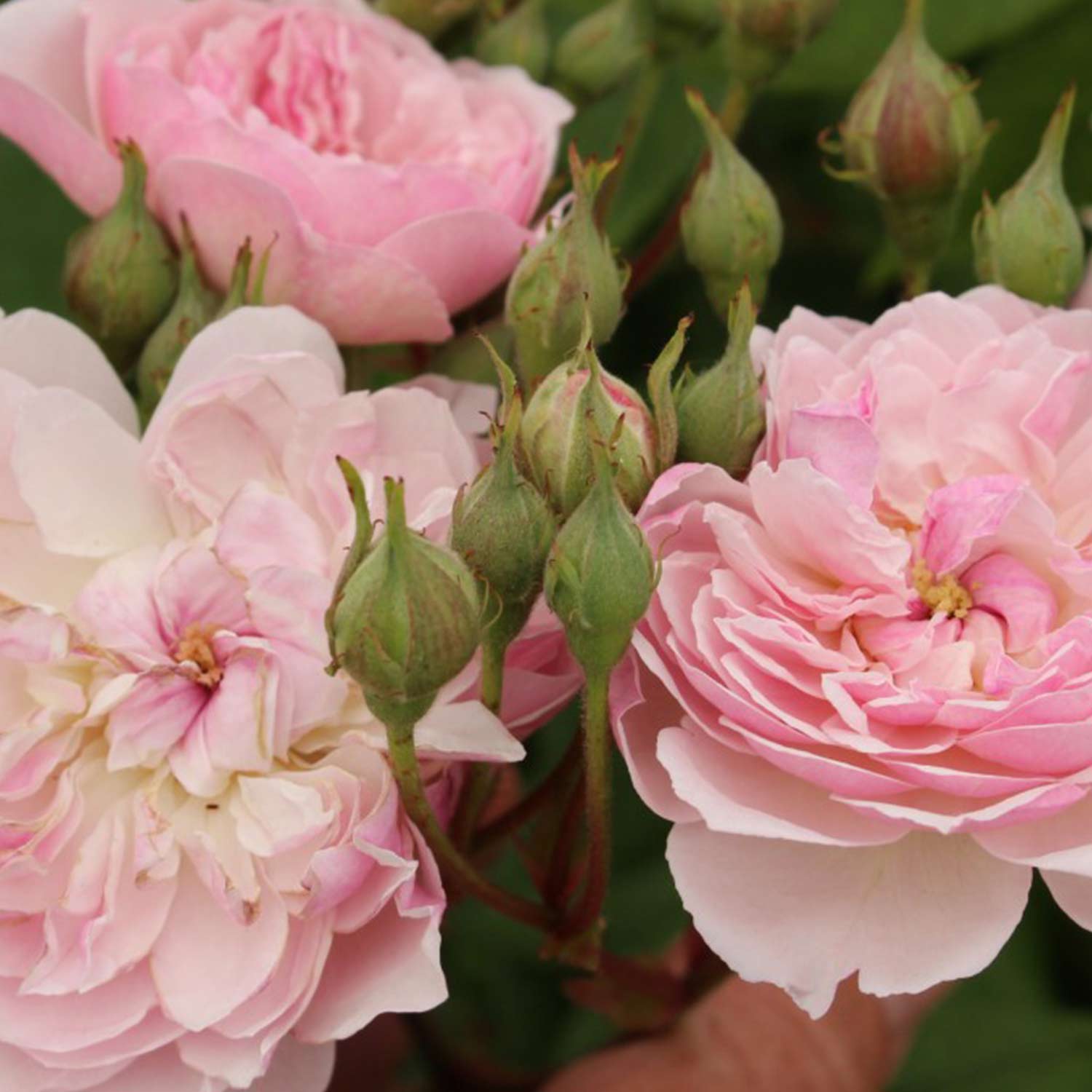 Von Juni bis zum ersten Frost erfreut sie mit einer Fülle von zartrosa, dichtgefüllten Blüten, die sich zum Rand hin malerisch aufhellen. Die orangegelben Staubgefäße in der Mitte setzen reizvolle Akzente, während die Blüten in Dolden angeordnet sind und einen süßen Duft verströmen.
