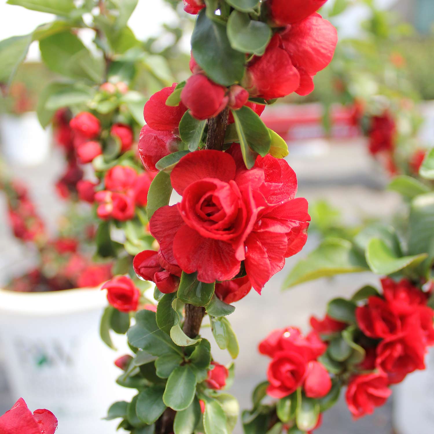 Die Zierquitte 'Scarlet Storm' ist eine spektakuläre Sorte, die mit ihrer intensiven scharlachroten Blütenfülle jeden Frühling zu einem unvergesslichen Erlebnis macht. Ihre stark gefüllten Blüten erinnern an Rosen oder Kamelien und setzen eindrucksvolle Akzente in jedem Garten.