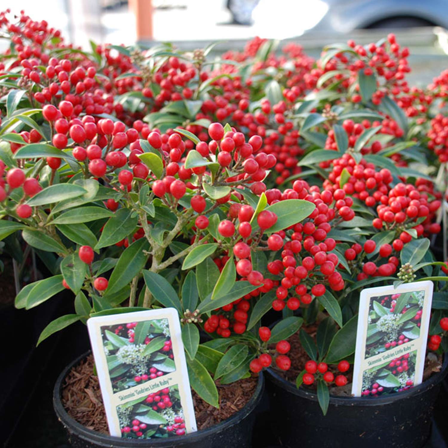 Ab Mai bis Anfang Juni trägt die Skimmie weiße Blüten, die sich zu dunkelroten Beeren verwandeln. Diese Beeren stehen in einem schönen Kontrast zur immergrünen Belaubung.