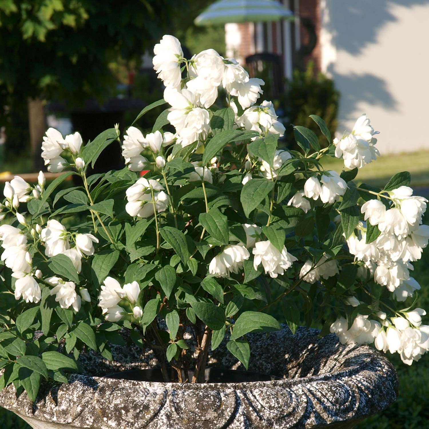 Wir lieben diesen Zwerg-Duftjasmin, weil er gesundes Laub, gefüllte strahlend weiße Blüten und einen intensiven Duft mit sich bringt und dennoch völlig anspruchslos und pflegeleicht ist. Ein wunderbarer Allrounder für alle Gartenstile von Feng Shui über Bauerngarten bis zum cleanen Architektengarten.