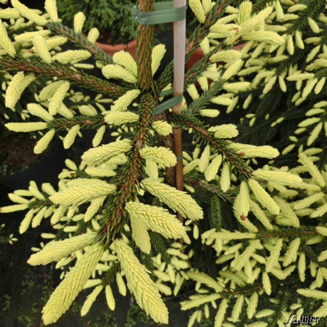 Die Gold-Fichte 'Aurea' ist bis -28°C winterhart. Die Nadeln sind kurz und dunkelgrün. Die Nadeln der neuen Austriebe sind hell- bis goldgelb und grünen allmählich nach. Die Gold-Fichte 'Aurea' ist eine langsam wachsende Sorte, die bis zu 20m hoch werden kann.