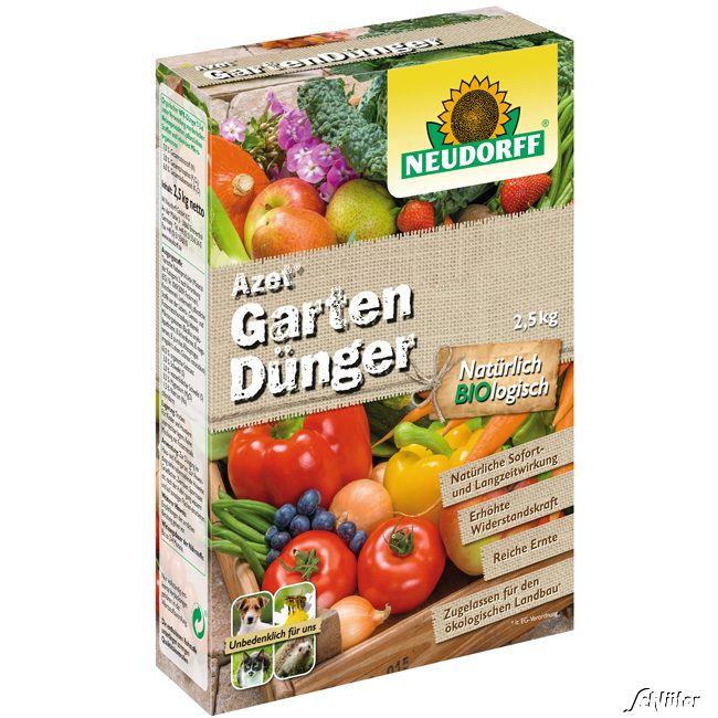 Der Azet® GartenDünger der Firma Neudorff enthält mindestens 70 % organische, humusbildende Substanz mit schnell und langsam wirkenden Nährstoffanteilen für eine Freisetzung über mehrere Wochen. Dadurch wirken die Nährstoffe kontinuirlich wie ein Nährboden auf die Mikroorganismen in der Erde und fördern so die gesunde Ernährung ihrer Pflanzen. Der Azet® Garten-Dünger ist die Weiterentwicklung des früheren Fertofit® Garten-Düngers von Neudorff.