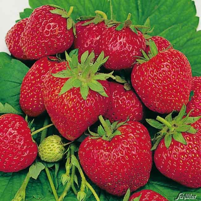 Die Erdbeere "Korona" ist besonders bekannt aus dem Großanbau. Sie ist ein prächtiger Massenträger und läßt sich zur Konservierung sowie zum Frischverzehr verwenden. Die Pflanzen haben einen starken Wuchs, sie bilden lockere, praktische Hochbüsche.