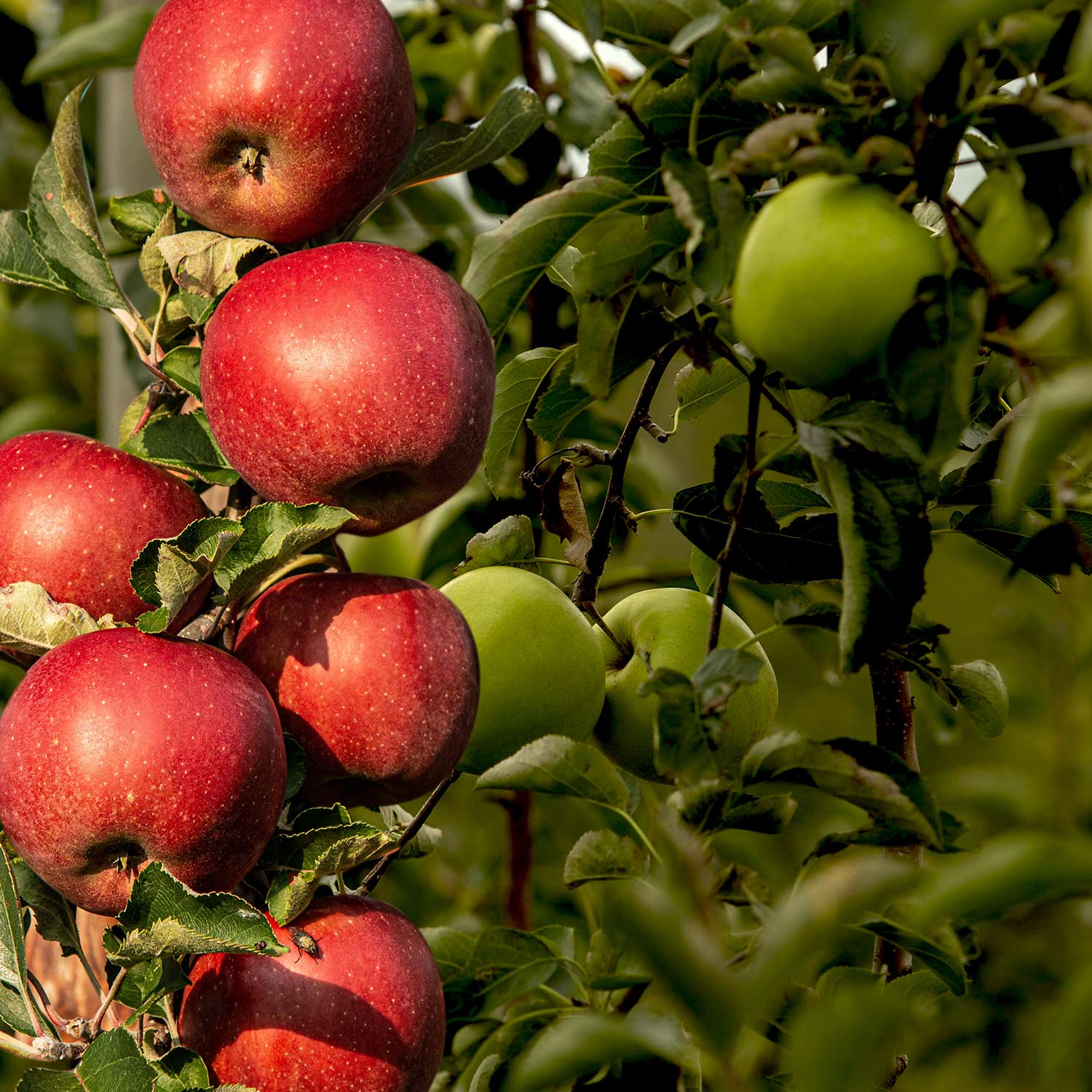 drei Apfelsorten auf einem Baum