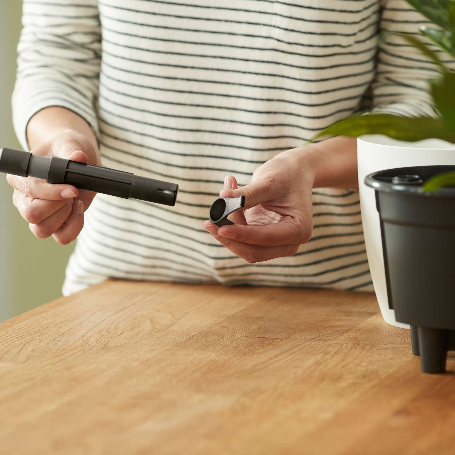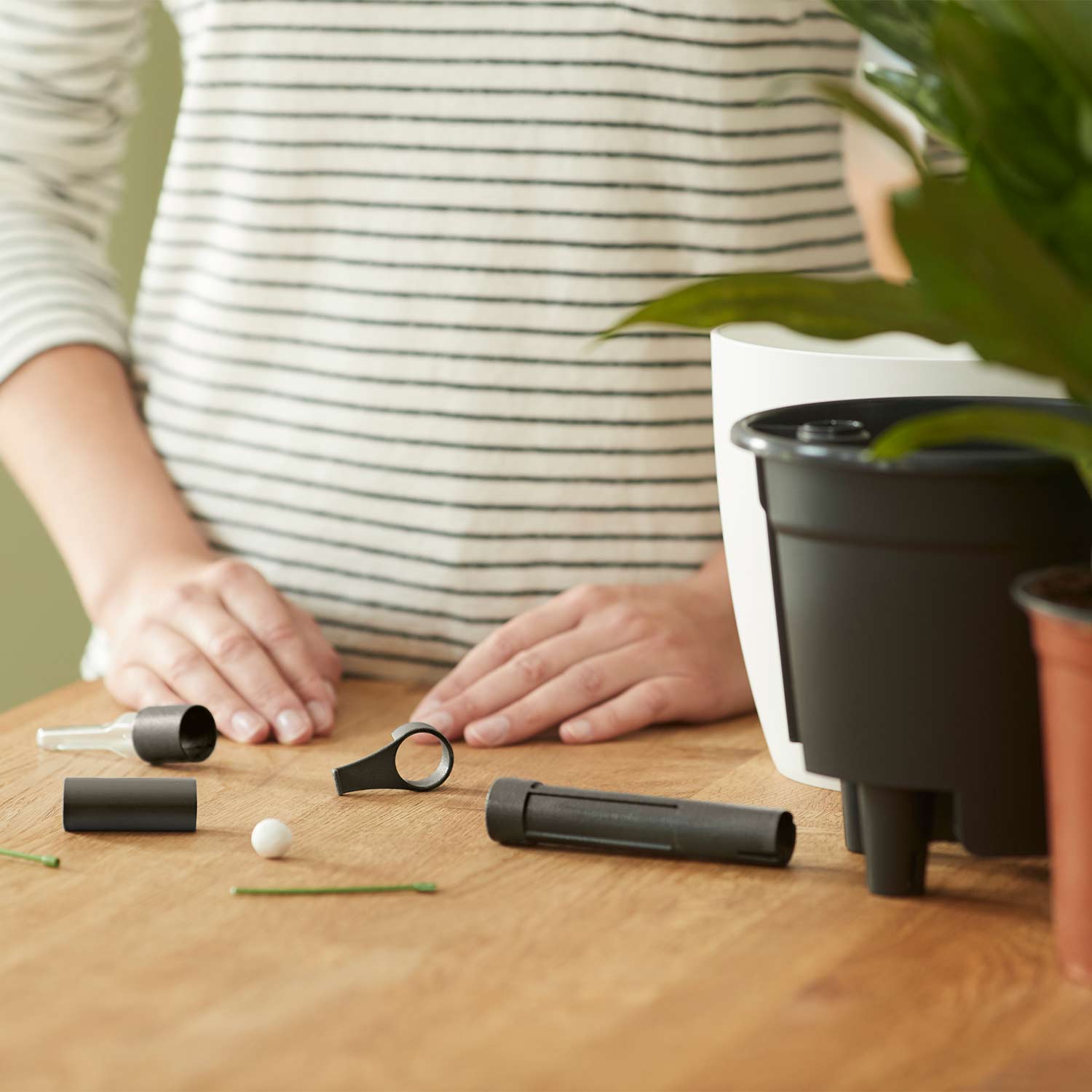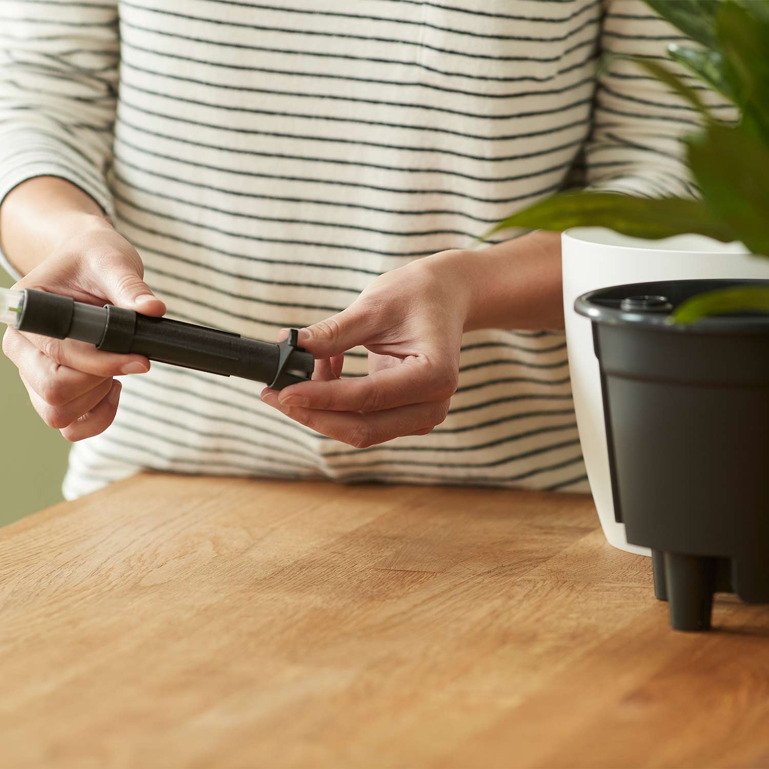 Das Prinzip des elho® Self-watering Insert ist simpel, aber effektiv: Es stellt sicher, dass Ihre Pflanzen immer genau dann Wasser bekommen, wenn sie es brauchen, und zwar in der richtigen Menge. Ein integrierter Wasserfühler gibt ein Signal, wenn das Wasser im System aufgebraucht ist. Anschließend versorgt das System Ihre Pflanzen automatisch und für mehrere Wochen mit Wasser, sodass Sie sich nicht täglich um das Gießen kümmern müssen.