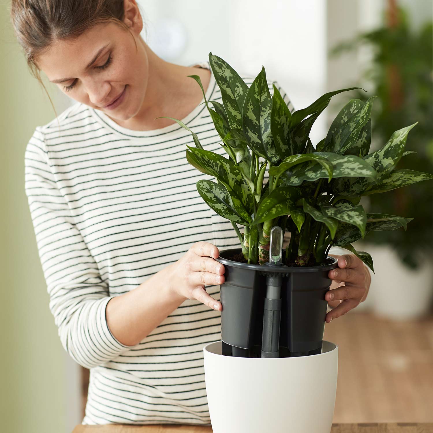 Das elho® Self-watering Insert ist die perfekte Lösung für alle, die das satte Grün von Zimmerpflanzen lieben, aber nicht immer die Zeit haben, sich um die regelmäßige Bewässerung zu kümmern. Es passt in die meisten Pflanztöpfe von elho®, kann aber auch problemlos in andere Töpfe, auch Keramiktöpfe, eingesetzt werden. Mit diesem cleveren Helfer können Sie ohne großen Aufwand ein grünes Zuhause genießen. Einfach das Wasser auffüllen, wenn der Fühler es anzeigt, und schon sind Ihre Pflanzen optimal versorgt - einfach traumhaft!