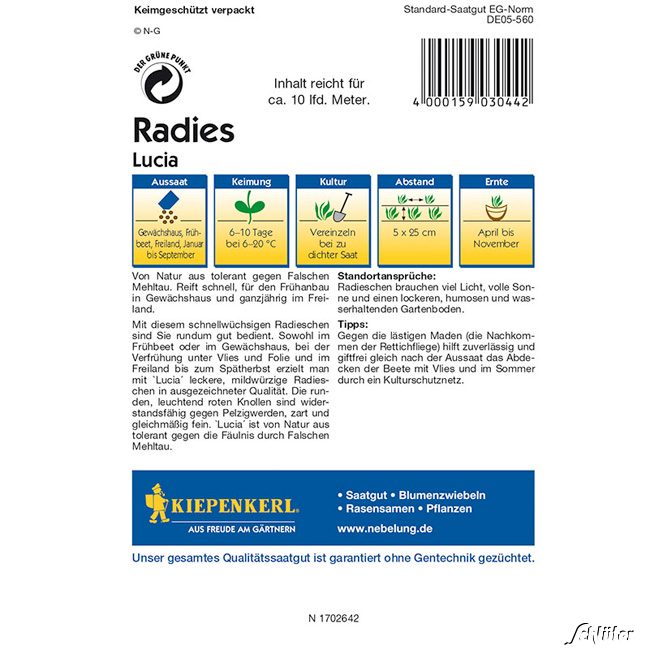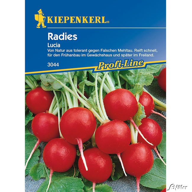 Die Radieschen sind von hervorragender Qualität. Ihre Knollen sind leuchtend rot, rund und sehr widerstandsfähig gegen Pelzigwerden. Des Weiteren ist "Lucia" tolerant gegenüber den Falschen Mehltau.
