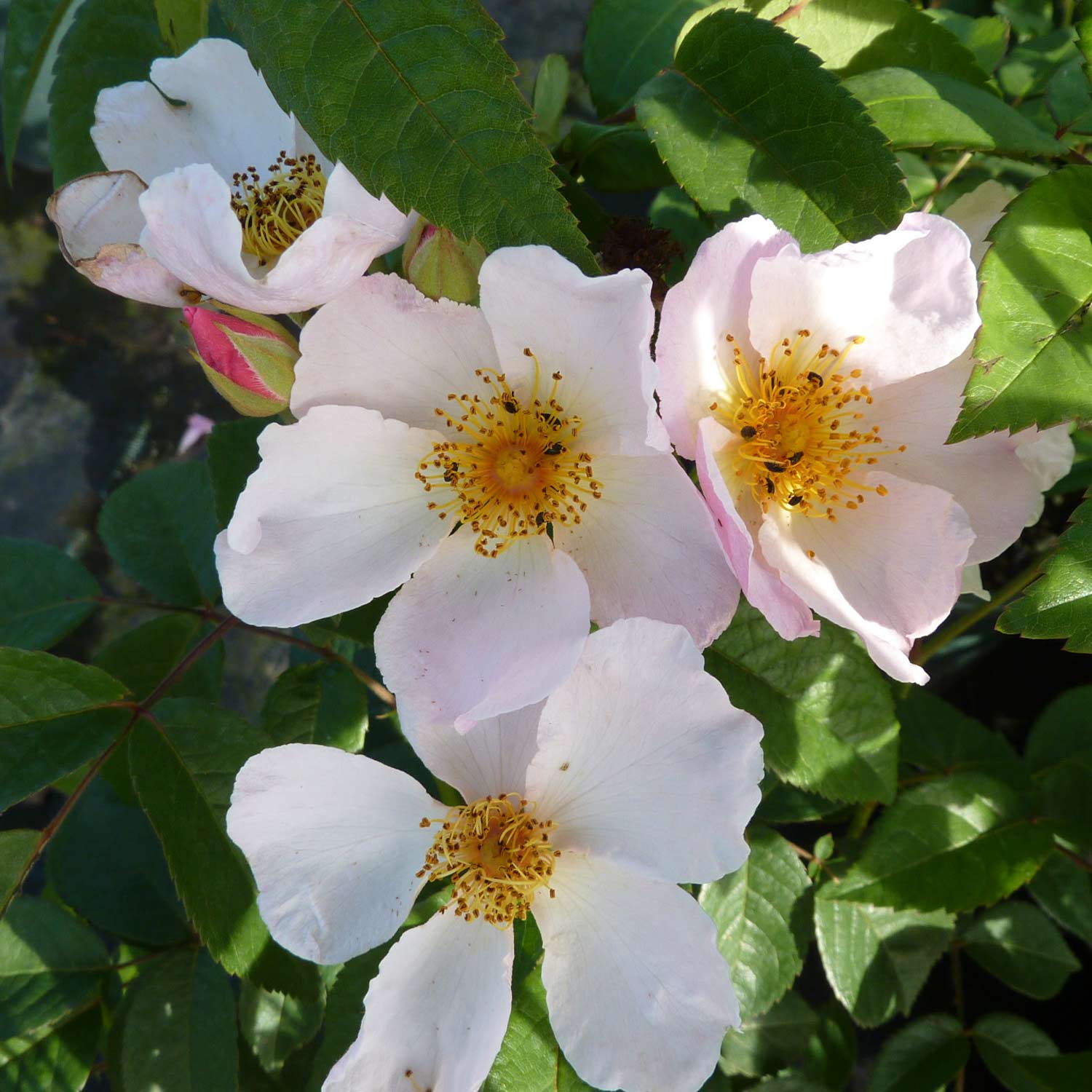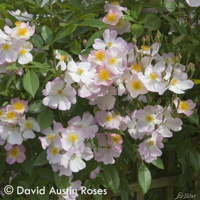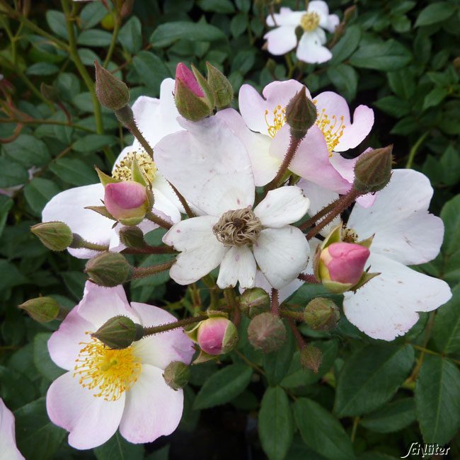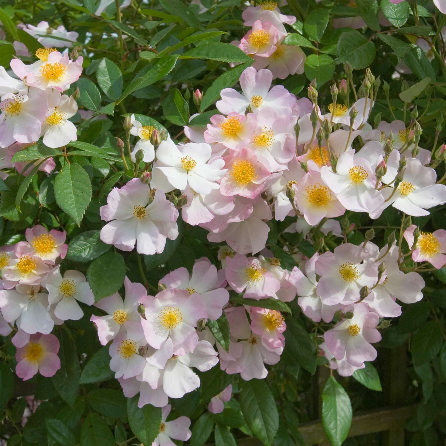 Mit ihren einfachen, weiß-rosa überhauchten Blüten, die wie kleine Sterne wirken, bietet diese Rose von Juni bis Juli ein spektakuläres Blütenmeer.