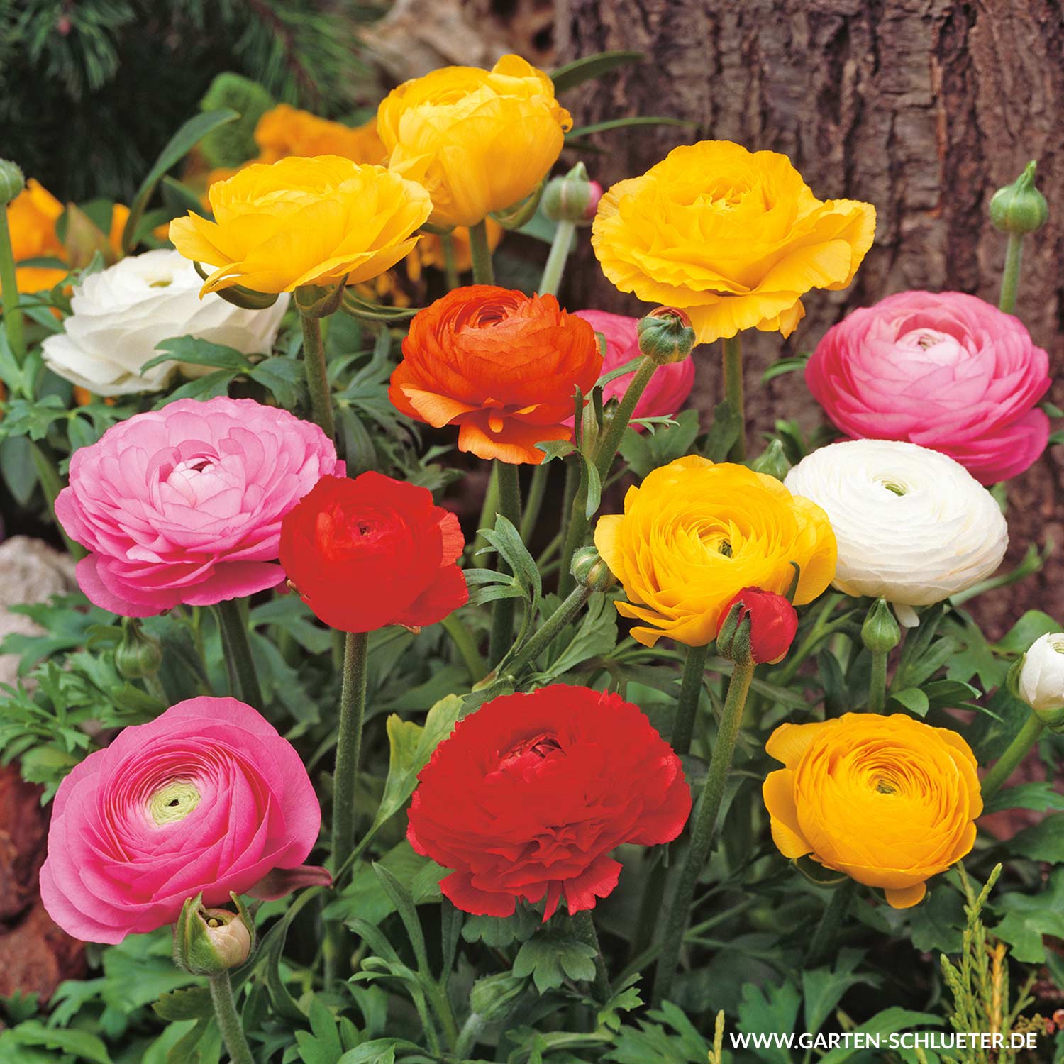 Diese Ranunkel-Mischung ist eine Auswahl von farbenfrohen und gefüllten Ranunkeln, die alle mit ihren tollen Blütenbällen überzeugen. Eine Pflanzung in der Gruppe erzielt den besten Effekt