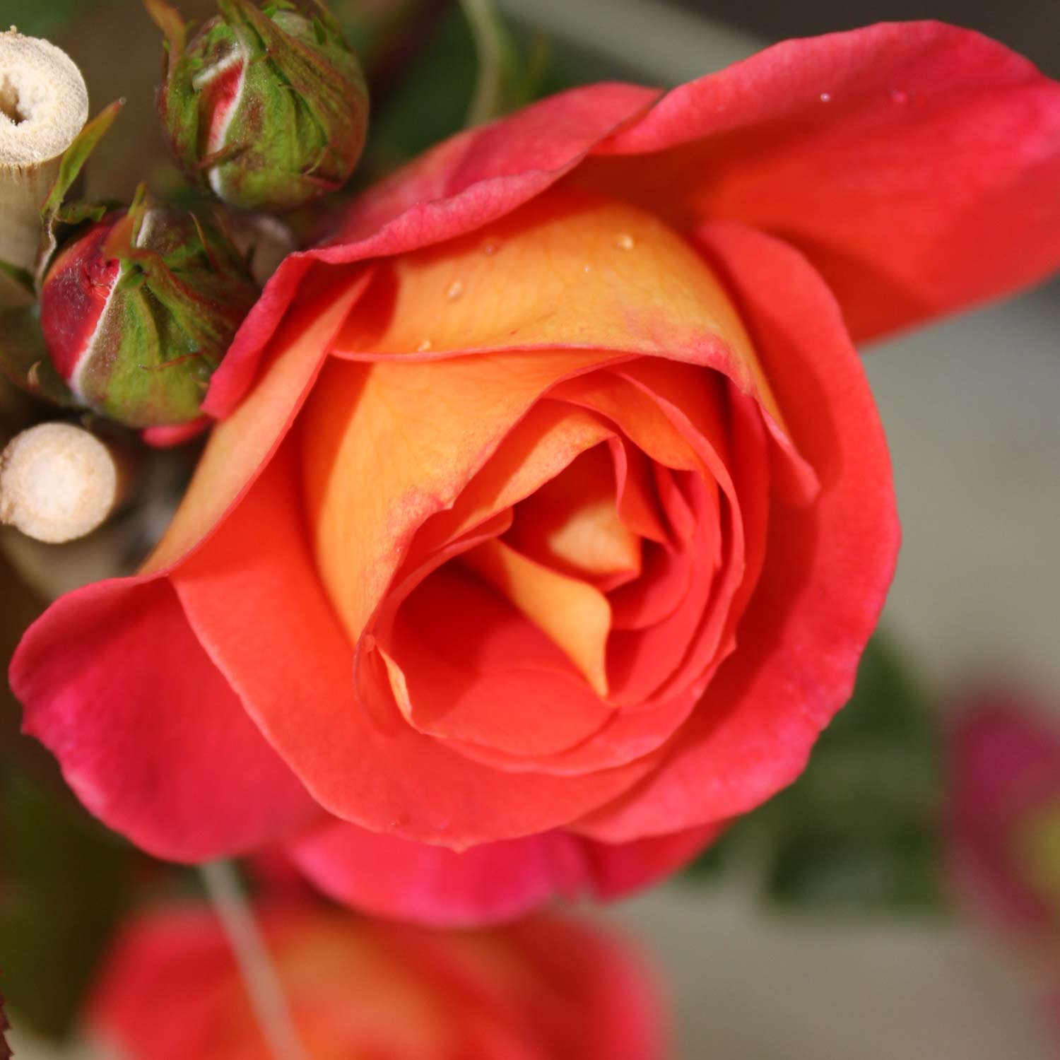 Die Blüten dieser schönen Beetrose sind einmalig in ihrem Farbverlauf von orangegelb bis orangerot. Durch die warme Blütenfarbe ergibt sich ein unwahrscheinlich freundliches und sommerliches Bild.