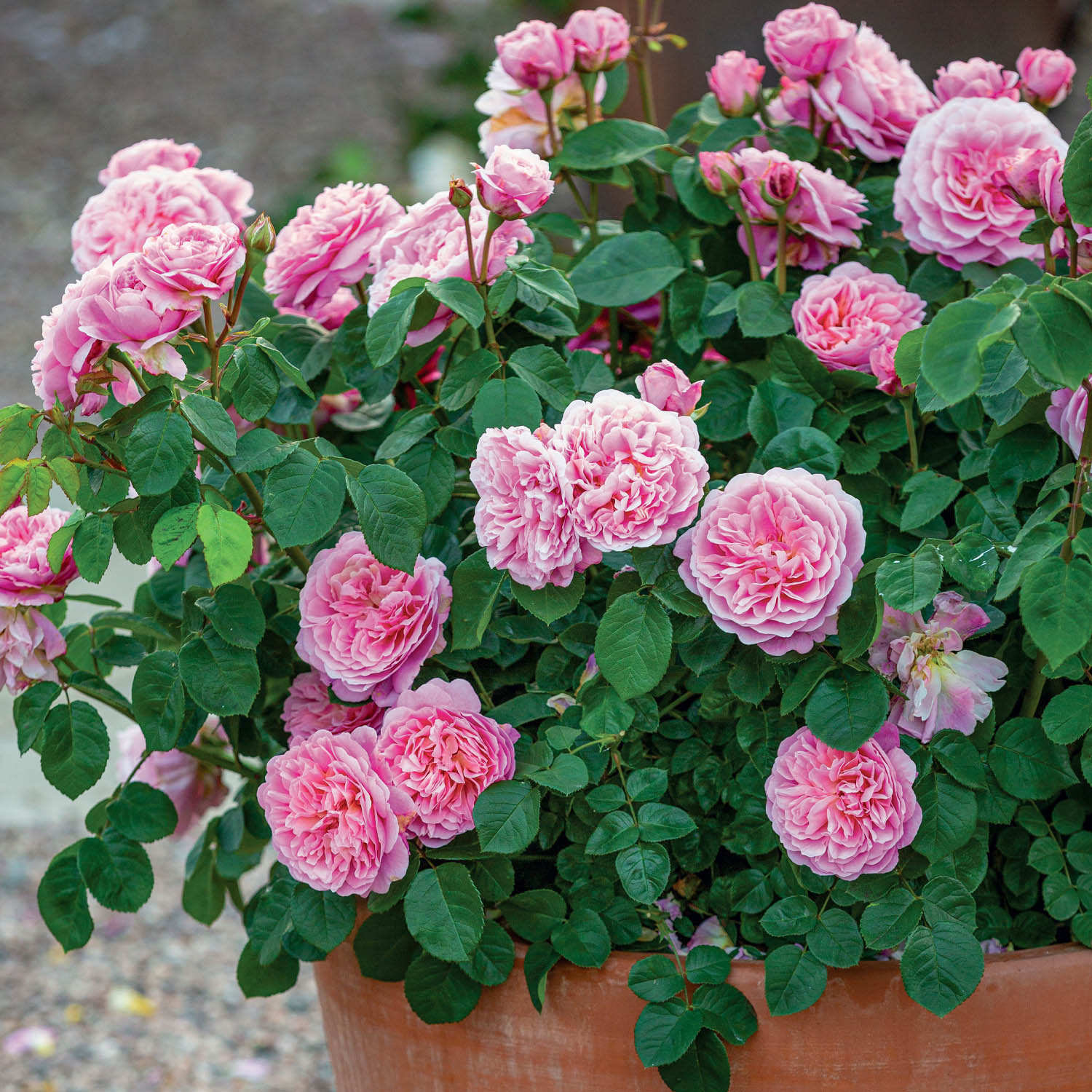 Die Strauchrose 'The Ancient Mariner®', eine Züchtung von David Austin aus dem Jahr 2015, gehört zu den modernen Romantikrosen und präsentiert sich mit üppigen, warmrosa Blüten. Diese öfterblühende Rose erfreut von Juni bis Oktober mit neuen Knospen und verströmt einen herrlich intensiven Duft nach Myrrhe.