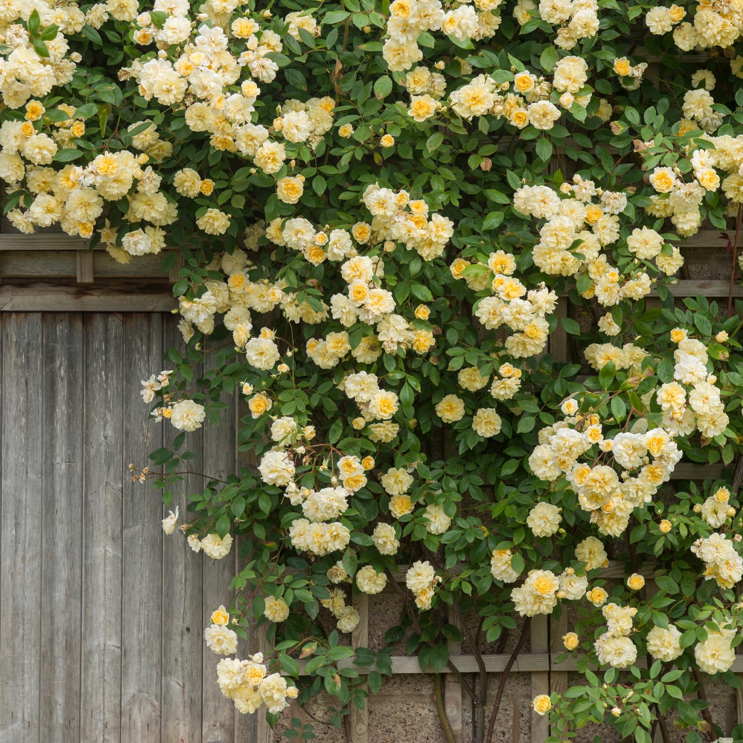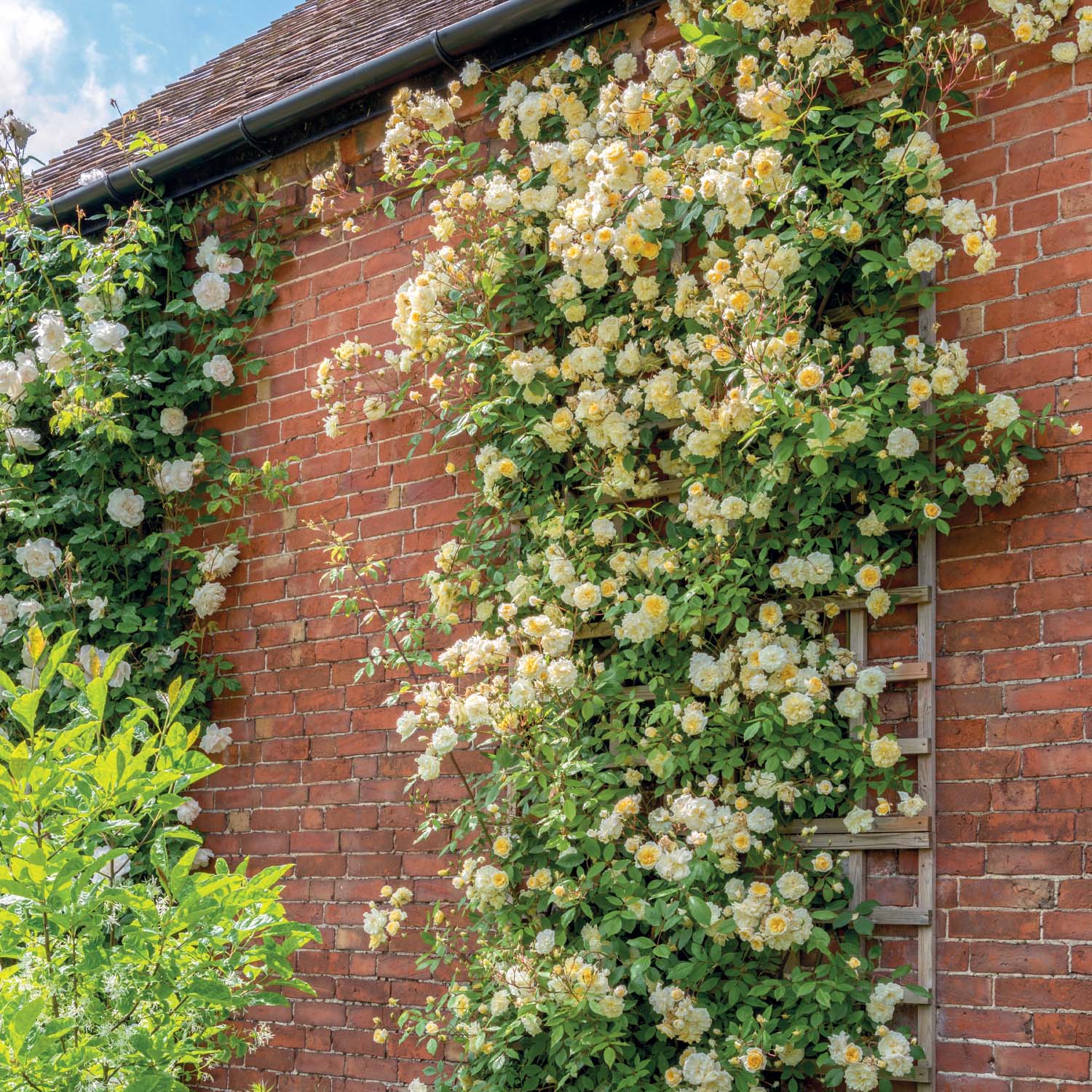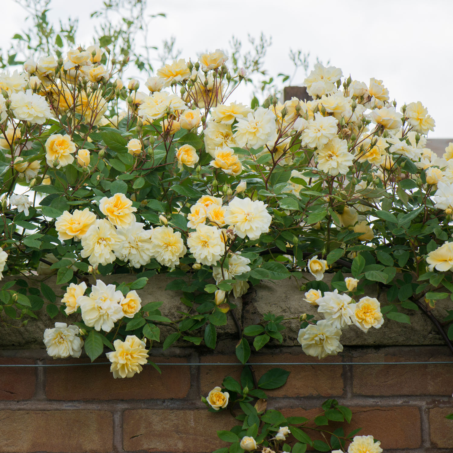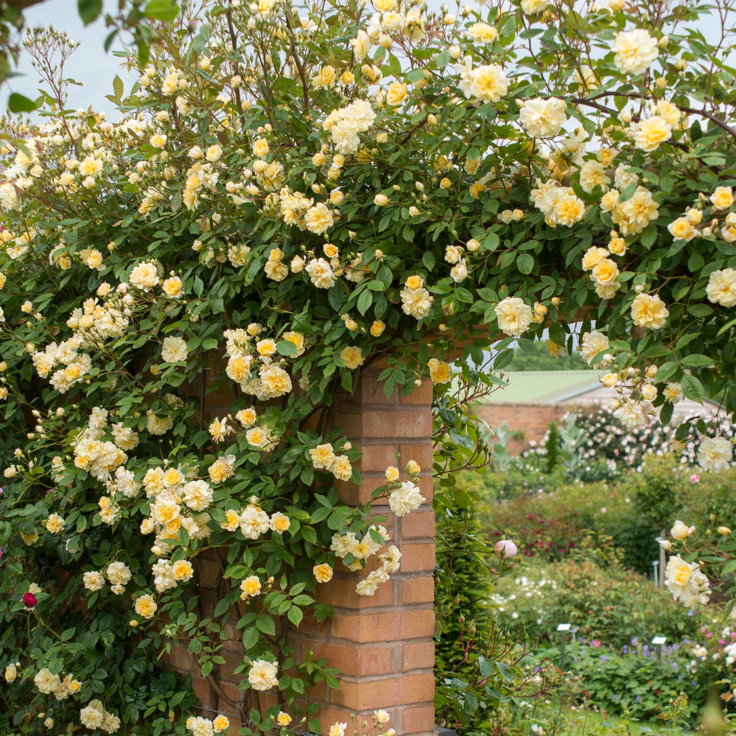 Von Juni bis September erfreut 'Malvern Hills®' mit Büscheln aus zart duftenden, gelben Blüten, die zu einem cremigen Weiß verblassen. Ihre gefüllten Blüten und das leicht bogig überhängende Wachstum verleihen ihr eine nostalgische Ausstrahlung.