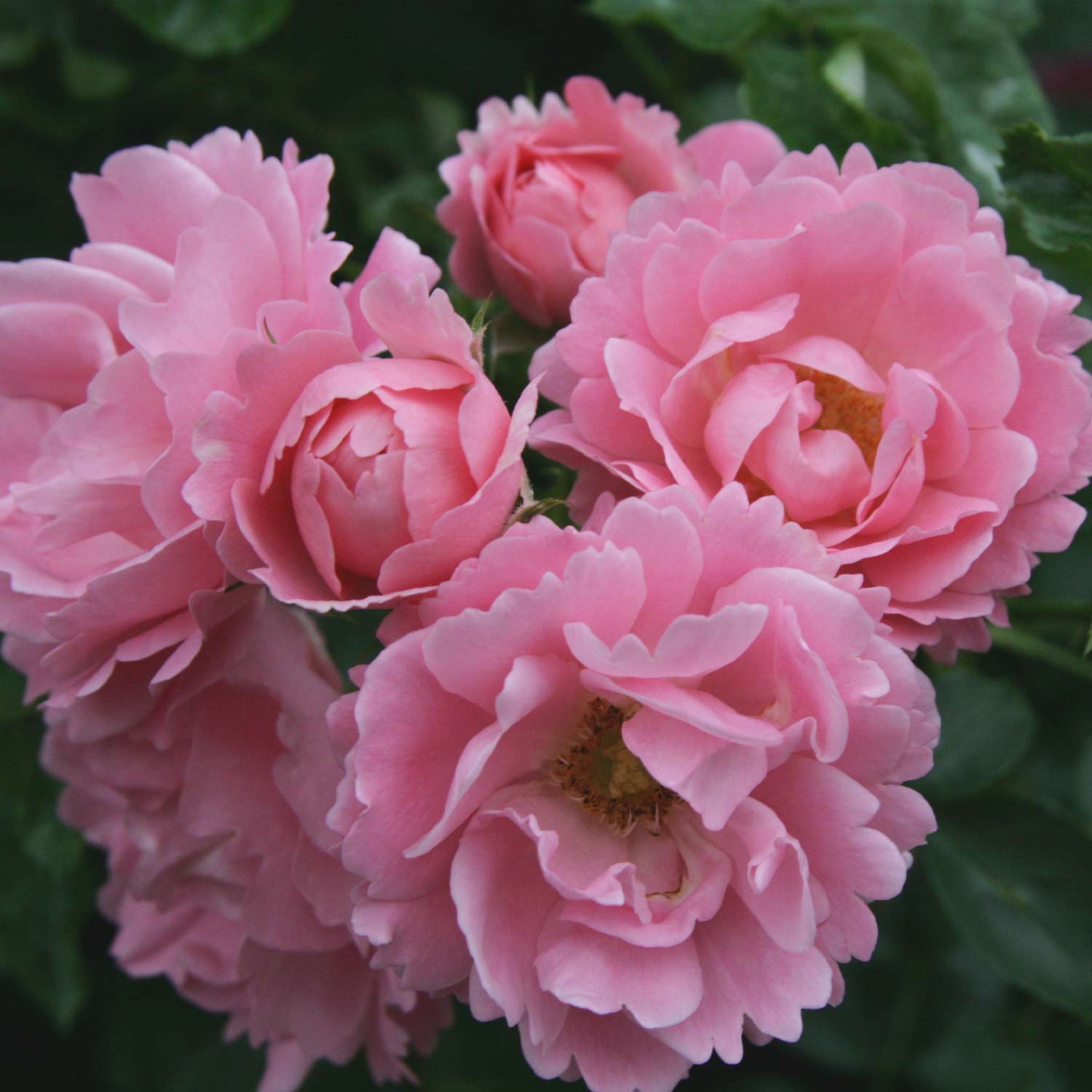 Die Blüten dieser Bodendeckerrose sind größer, halbgefüllt und strahlen in einem leuchtenden reinrosa. Die Blütenblätter sind leicht gewellt, schalenförmig und stehen in lockeren Dolden, mit denen sie das grüne Blattwerk verzieren.
