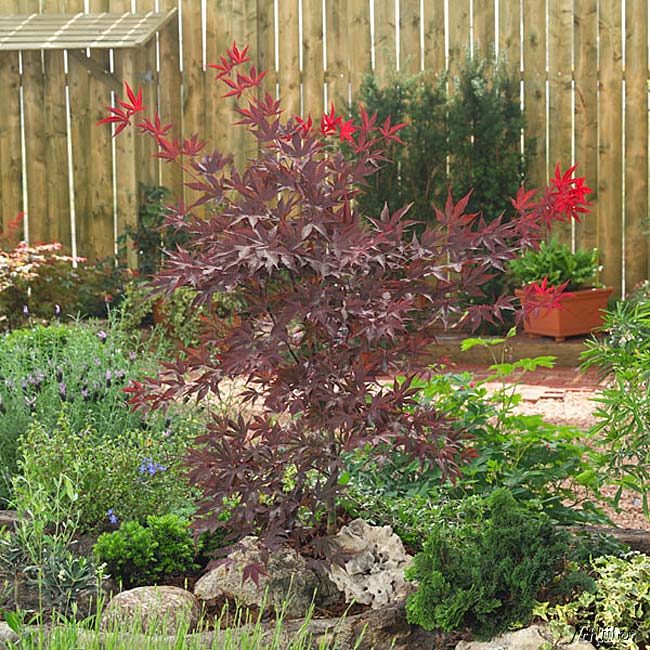 Der Fächerahorn "Bloodgood" wird bis zu 3-4 Meter hoch und hat schwarzrote Blätter, die stark eingeschlitzt sind und im Herbst leuchtend rot ist. Da der Fächerahorn saure Böden mag, sollten Sie Torf in die Erde einarbeiten.