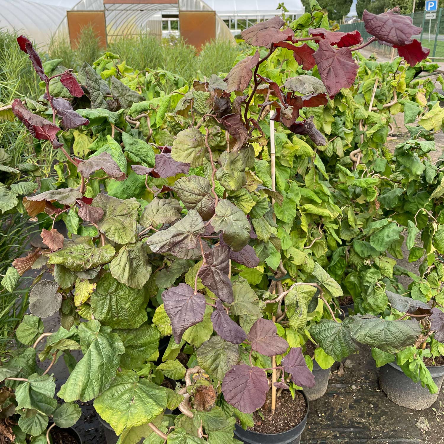 Die Korkenzieherhaselnuss 'Red Majestic' wächst breit und aufrecht mit purpur-rotem Laub und korkenzieherartig gedrehten Zweigen. Die männlichen Kätzchen sind purpur-rot. Die Haselnussfrucht reift im Herbst.