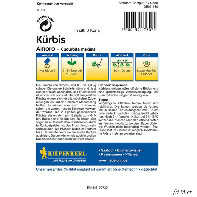 Eine weitere Besonderheit, die dieser Kürbis mit sich bringt, ist seine Eignung für Hochbeete und Kübel. Die Pflanze bildet nämlich zunächst bis zu 8 Früchte direkt an der Basis der Pflanze aus, bevor sie überhaupt beginnt Ranken zu bilden. Der Standort sollte dabei möglichst sonnig und eine gleichmäßige Wasserversorgung gewährleistet sein. Wie auch andere Kürbisse benötigt auch 'Amoro' einen frischen, sehr nährstoffreichen Boden. Es darf gerne etwas nachgedüngt werden.