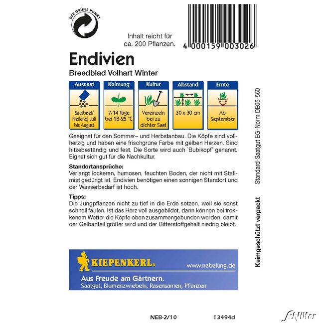 Der Endiviensalat "Breedblad Vollhart Winter" ist ideal geeignet für den Sommer- und Herbstanbau. Die leckeren Köpfe sind außen hellgrün und haben ein weiß-gelbes inneres, knackiges Herz.