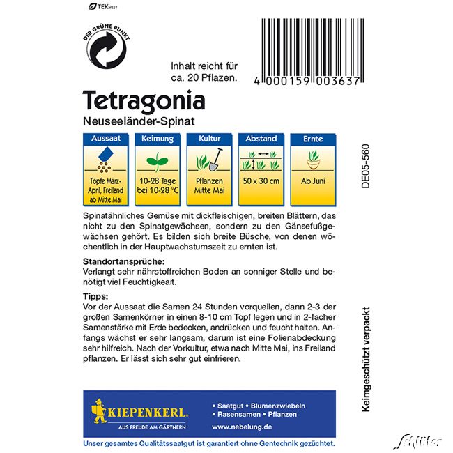 Die Blätter von "Tetragonia" sind dickfleischig und breit. Dieser Spinat bildet breite Büsche, deren Blätter Sie in der Hauptwachstumszeit wöchentlich ernten können. Da der Neuseeländische Spinat frostempfindlich ist, sollten Sie ihn bei Bedarf vor Frösten schützen.